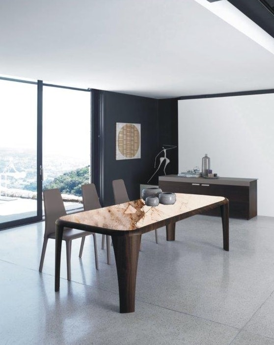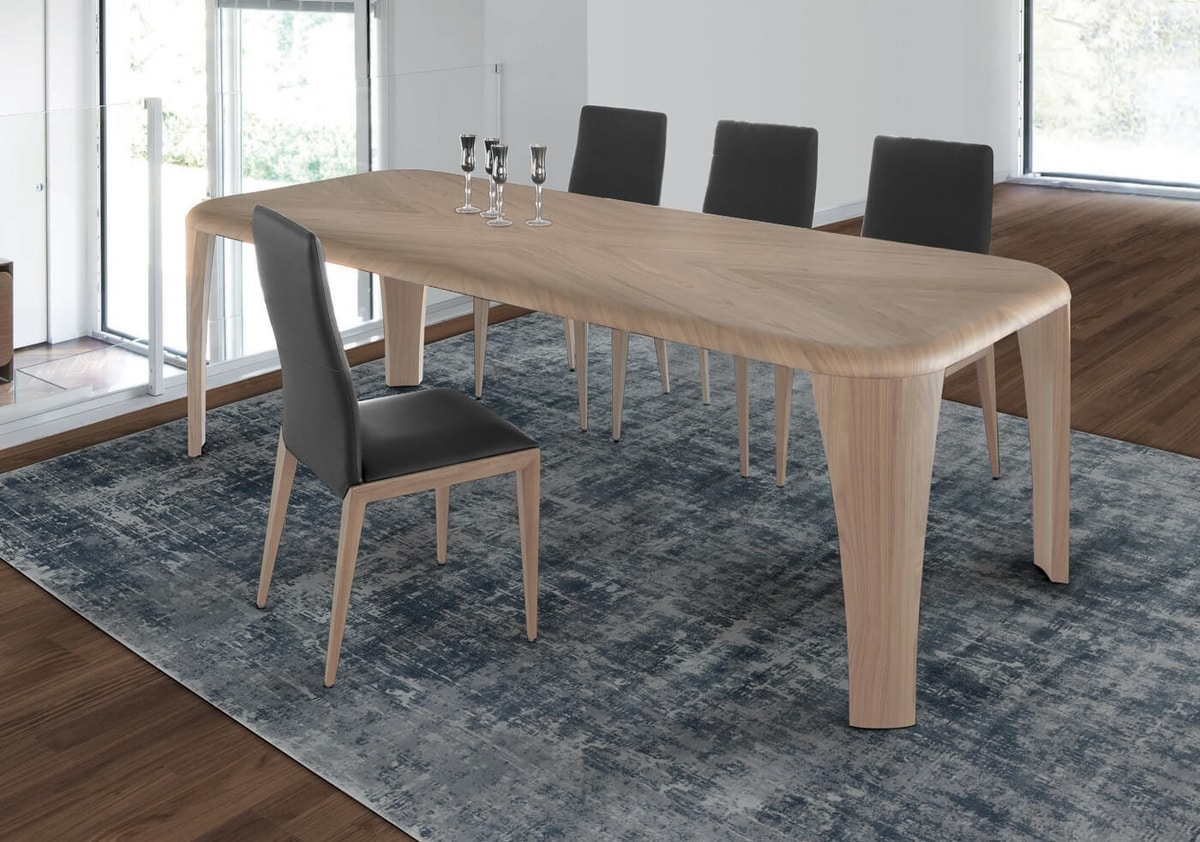 Fester Tisch, holzfurnierte Beine und Platte 50 mm.