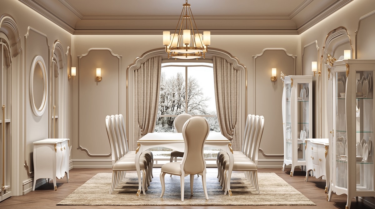Esstisch aus lackiertem Holz mit dekorativen Details in Goldfinish.