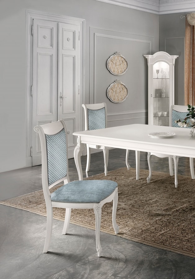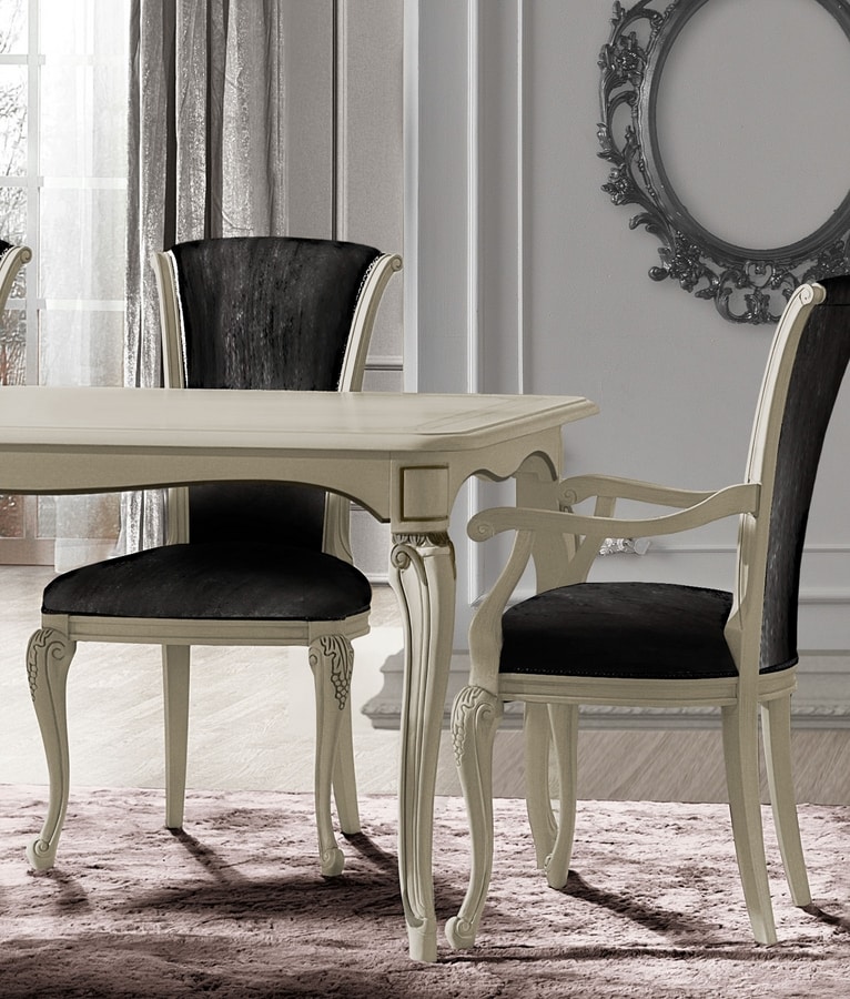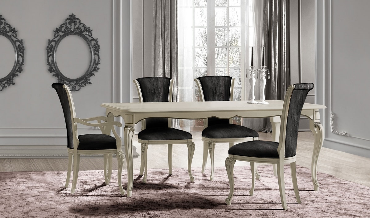 Lackierter Holztisch. Mit handgefertigten Schnitzereien verziert. Erhältlich in fester und erweiterbarer Version. Ideal für Speisesäle mit raffiniertem Geschmack.