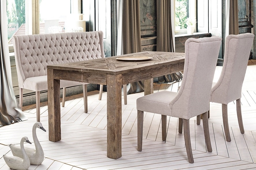 Esstisch aus recyceltem Ulmenholz, Platte mit Antik-Parkett-Finish. Finish auf Nitrozellulosebasis. Beine zum Zusammenbauen.
