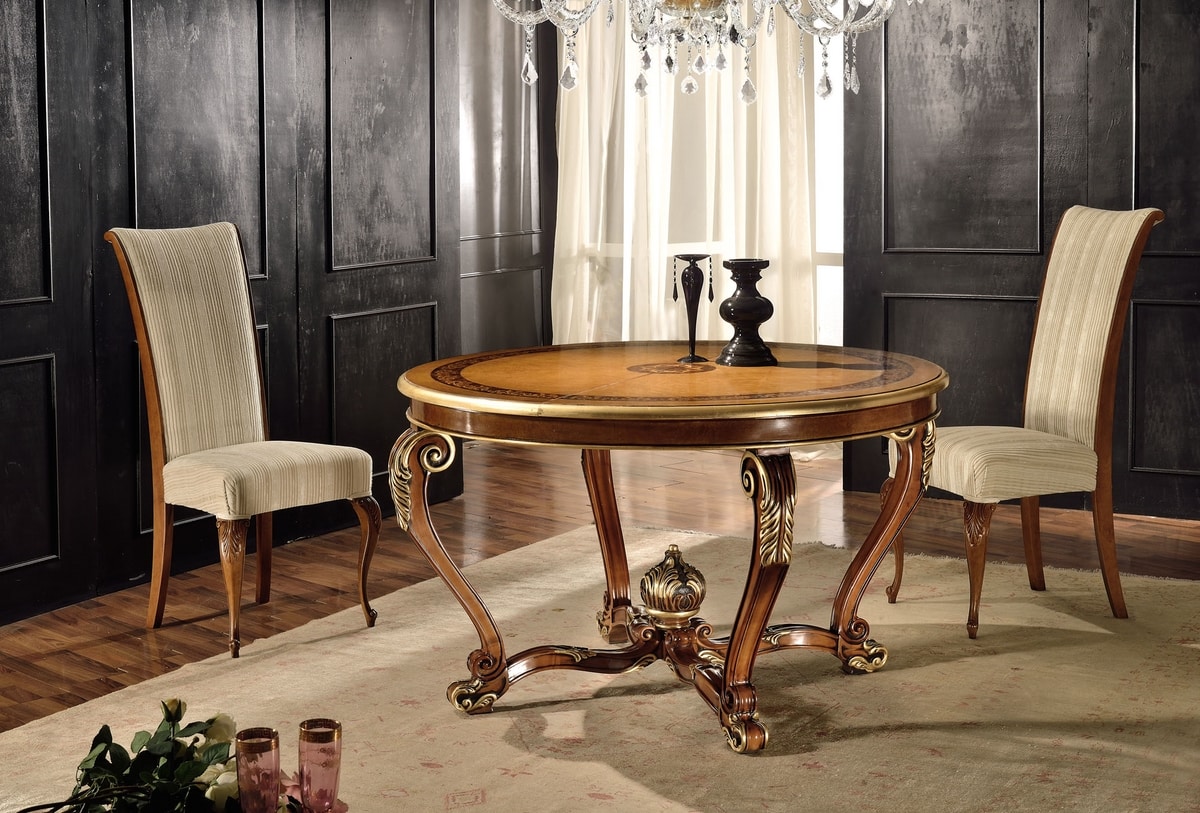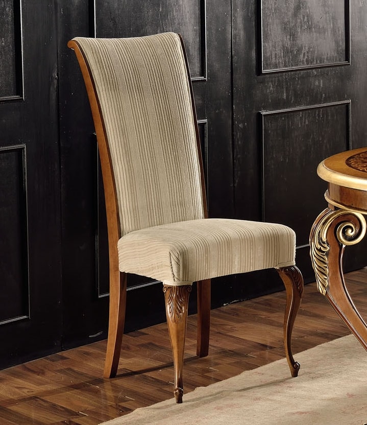 Holzstuhl im klassischen Stil, gefüllter Sitz und Rücken. Angereichert mit dekorativen Schnitzereien.