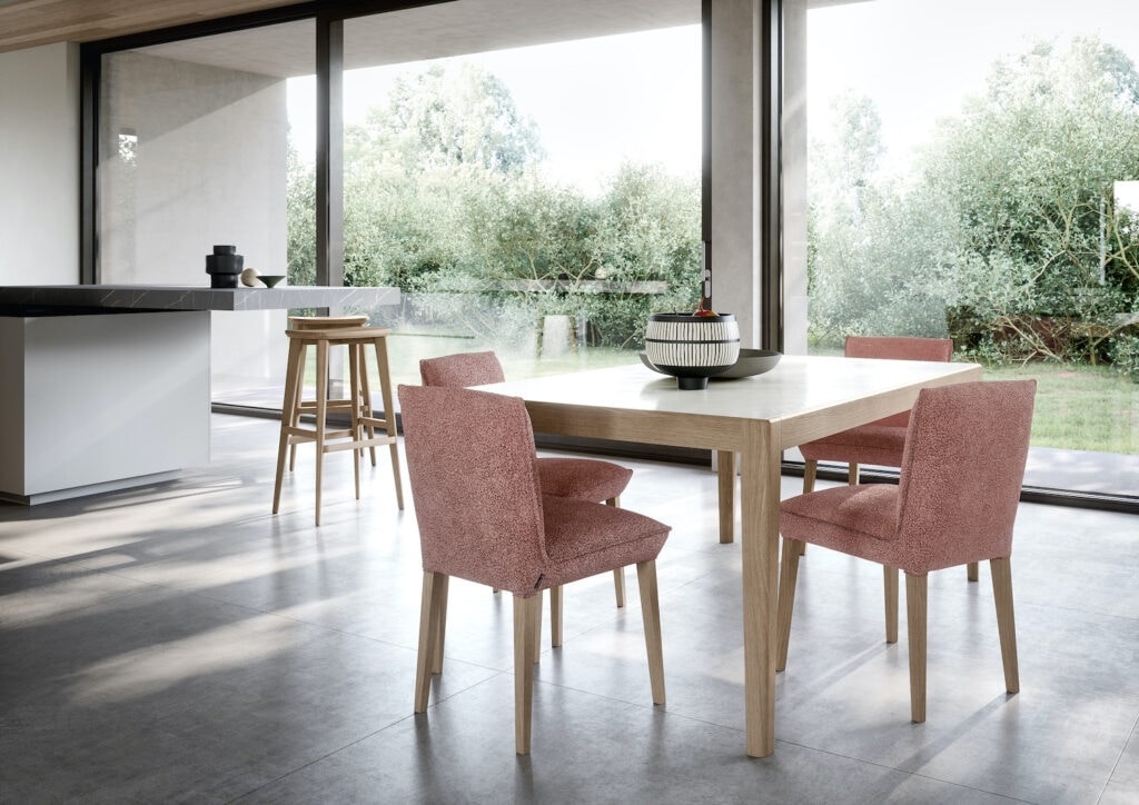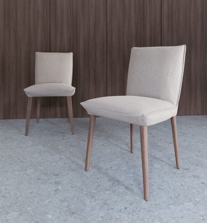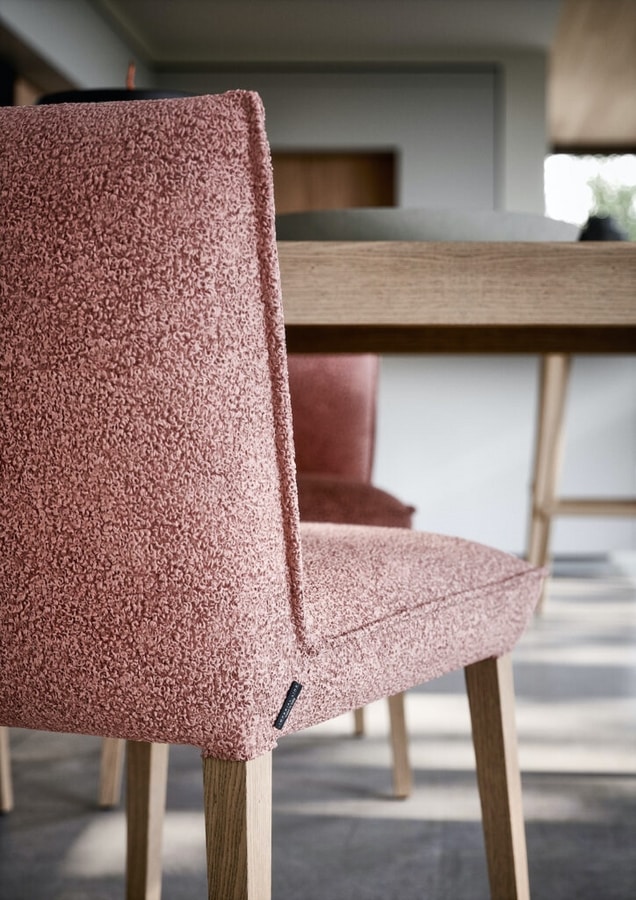 Stuhl mit erhöhten Nähten und Beinen aus Massivholz. Sitzfläche (mit elastischen Gurten) und Rückenlehne (straffer Stoff) gepolstert mit 13 überlappenden Schaumstoffen in unterschiedlichen Stärken und Dichten.