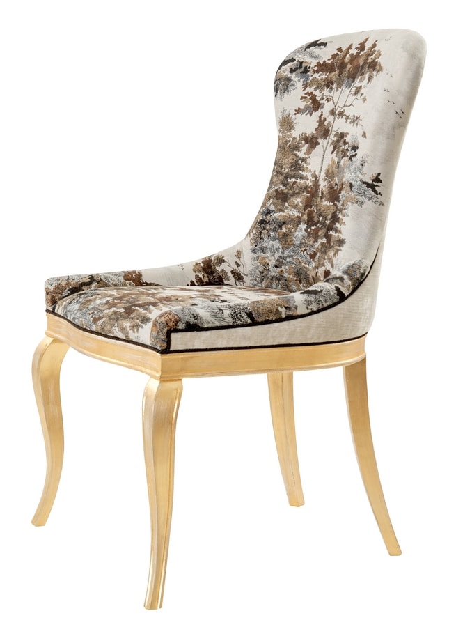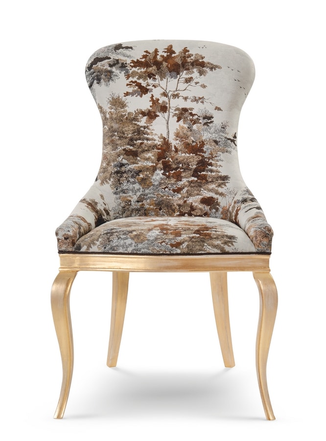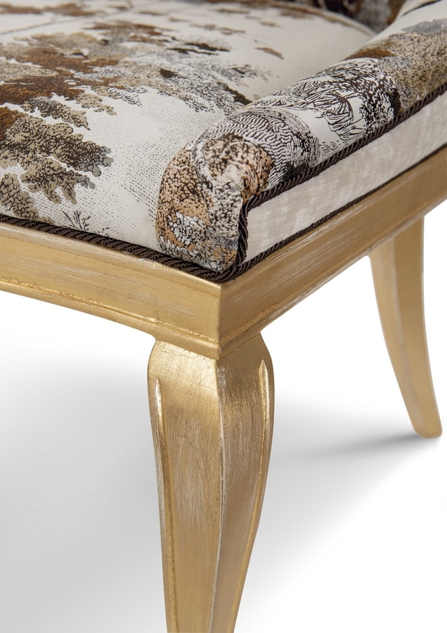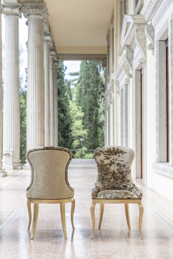 Stuhl mit geformten Beinen und einem Rahmen in verzweifeltem Blattgold über Baiser weißer Basis (OR5 -Finish). Der gepolsterte Sitz und die Rückseite werden in zwei koordinierten Stoffen gepolstert, wobei raffinierte Texturen und dekorative Eleganz kombiniert werden.