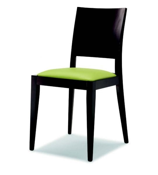 Stuhl aus gebeizter Buche, gepolsterter Sitz aus Stoff.