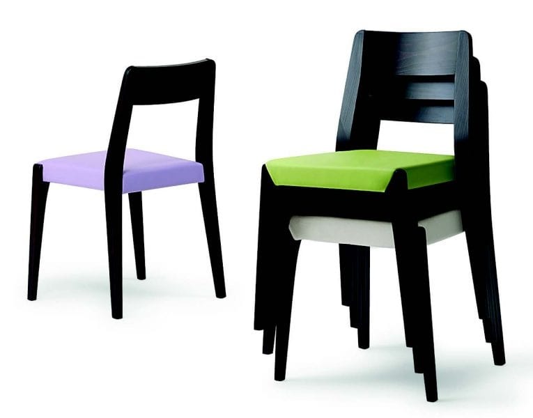 Stapelbarer Stuhl in gebeizter Buche. Sitz in Ecru Baumwolle, Kunstleder oder Stoff.