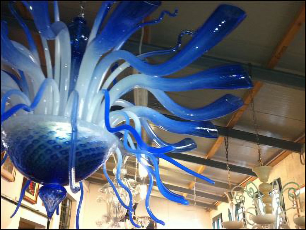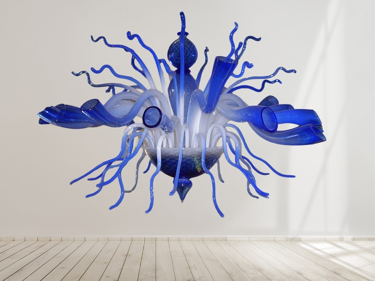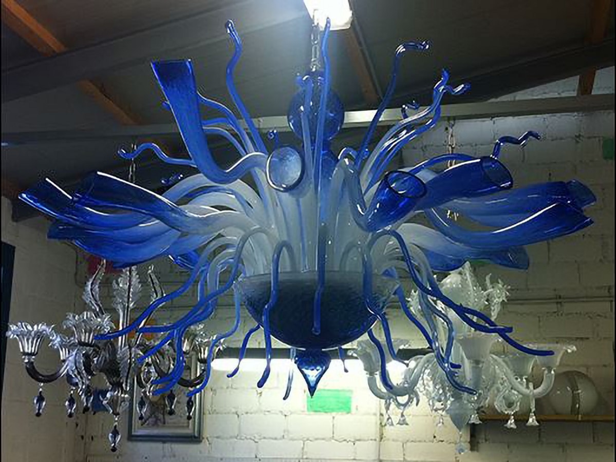 Moderner Kronleuchter aus weißem und blauem venezianischem mundgeblasenem Glas