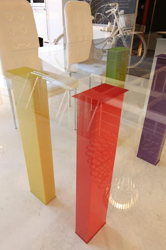 Moderne Tisch mit seinem Bein mit farbigem Glas abgedeckt. Linear gehärtetem extra leicht trasparent Glasplatte.