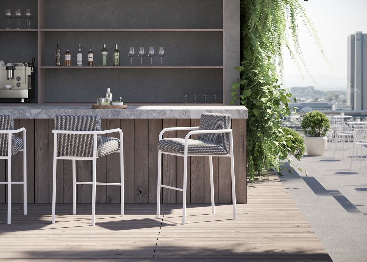 Der Hocker der Kollektion Pilar zeichnet sich durch einen zeitgenössischen Stil und maximalen Komfort im Sitz aus. Seine eleganten Formen sind ideal für jede Außenumgebung und zeichnen sich durch große Eleganz dank seines essentiellen Designs aus. Die Aluminiumstruktur garantiert Stabilität und Widerstandsfähigkeit, das Kissen aus Stoff, ideal auch für den Außenbereich, kann leicht entfernt, abgezogen und gereinigt werden.