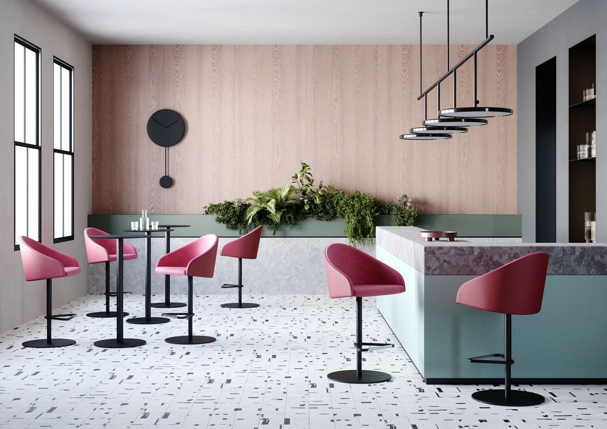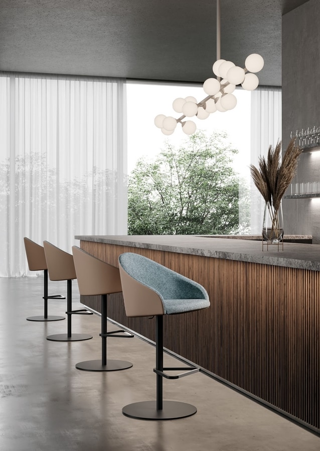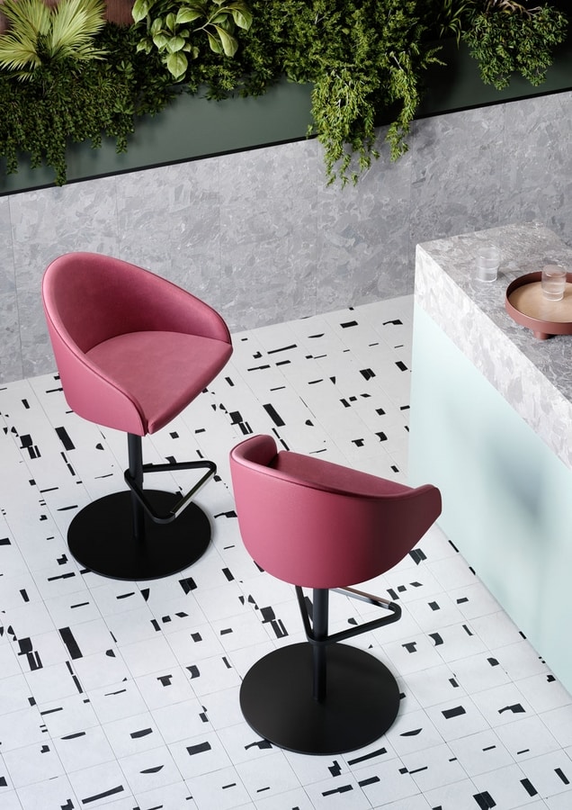 Der KAMEO STOOL zeichnet sich durch seine bequeme Sitzfläche aus, die sich aus einer geschwungenen Sitzfläche und einer Rückenlehne zusammensetzt, die ein- oder zweifarbig ist und einen lebendigen und modernen Touch hat. Weiß lackiert, schwarz lackiert oder verchromt, ist das Untergestell in zwei Varianten erhältlich: mit festem, Halbkufengestell, dass ihm eine grafische Eleganz verleiht, oder mit einem drehbaren Untergestell, welches mit Gaslift und Fußstütze ausgestattet ist und sich jeder modernen Umgebung anpasst.