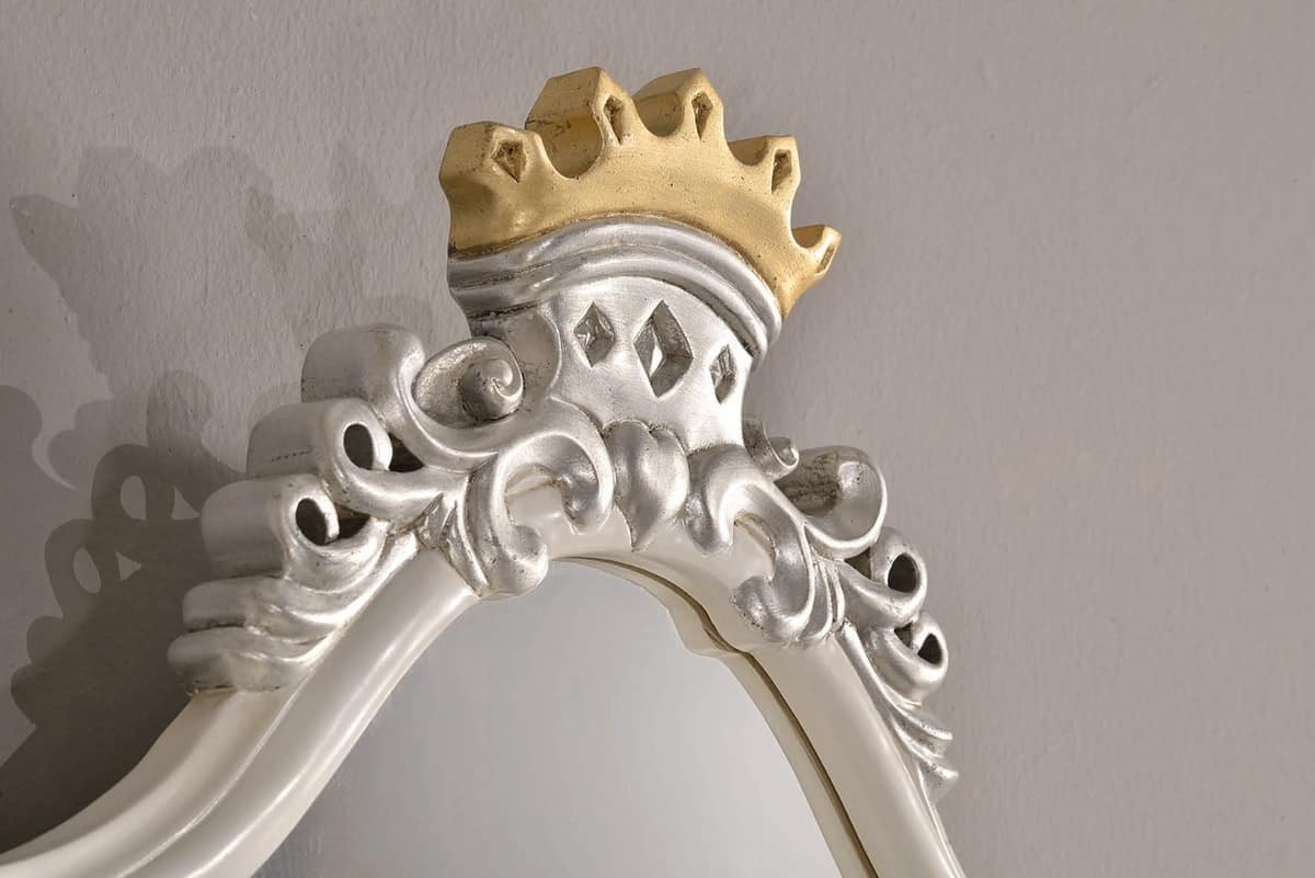Einzelbett mit Seitenstruktur, mit Spiegel, Toilette, Hocker, zwei Kommoden, Nachttisch, weißem Finish und Blattsilber.