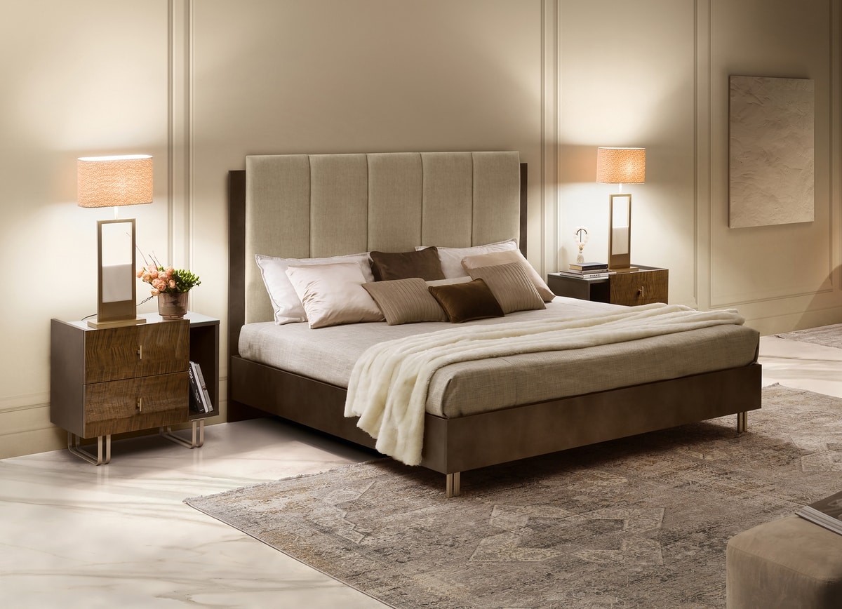 Preise anfordern Ähnliche ProdukteDas Bett ist in zwei Versionen erhältlich: einmal mit Bettrahmen und Fußteil in mattem Bronze-Finish und als vollgepolsterte Version.