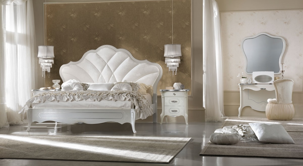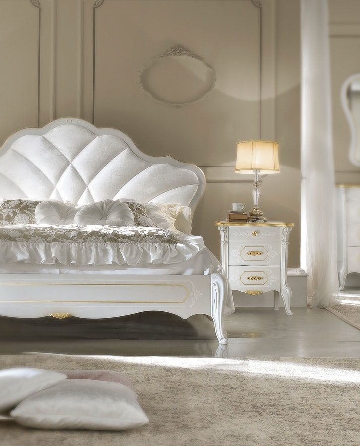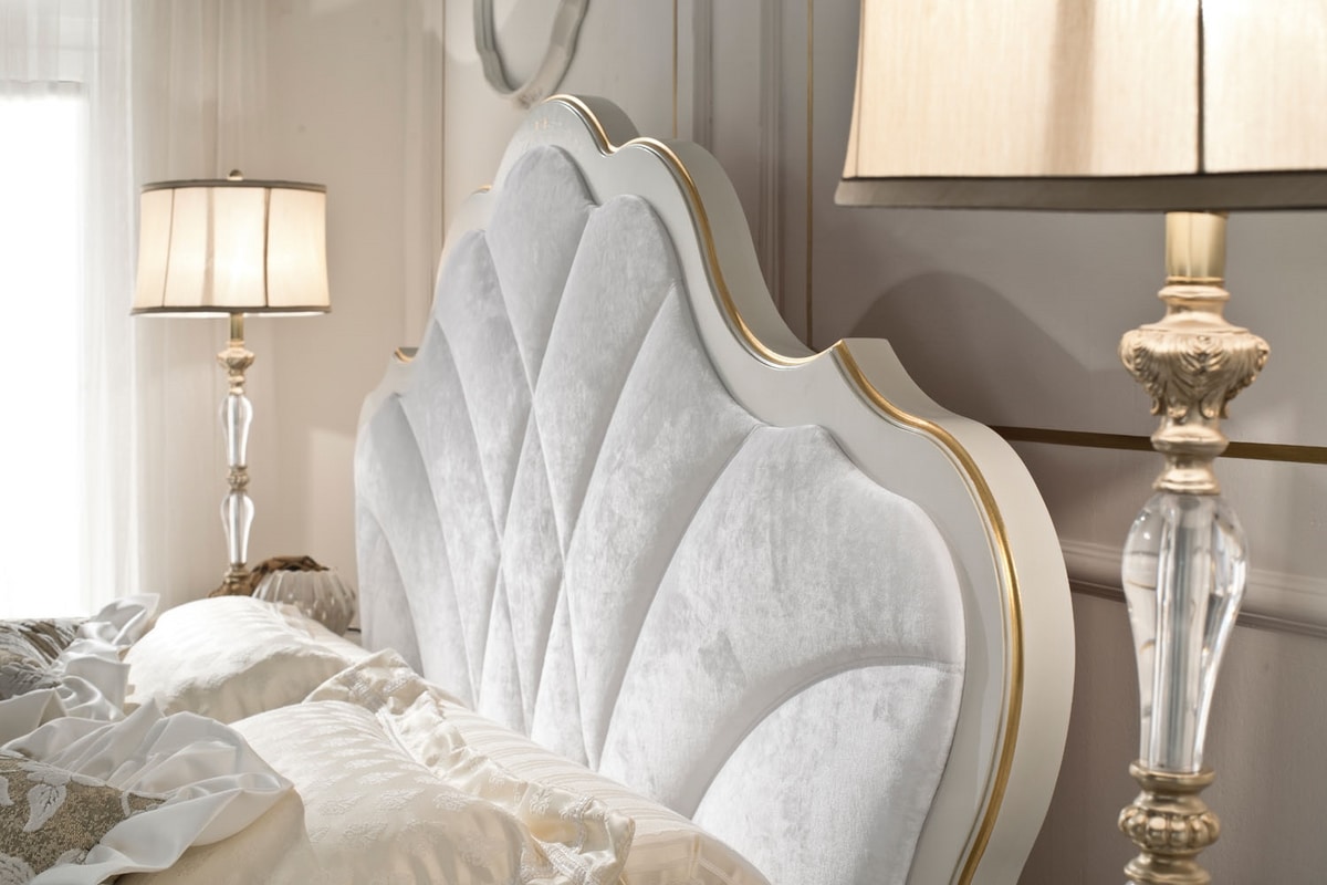 Bett aus lackiertem Holz mit gepolstertem Kopfteil. Klassische Linien und wertvolle Dekorationen.