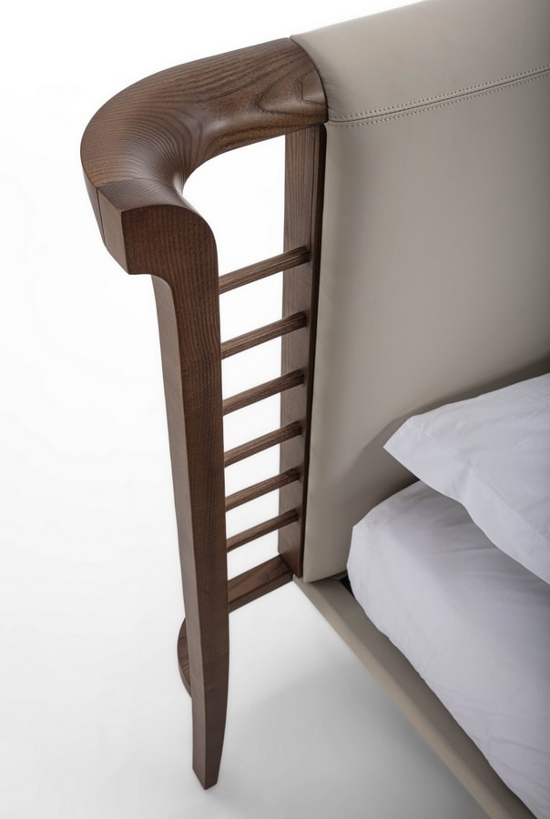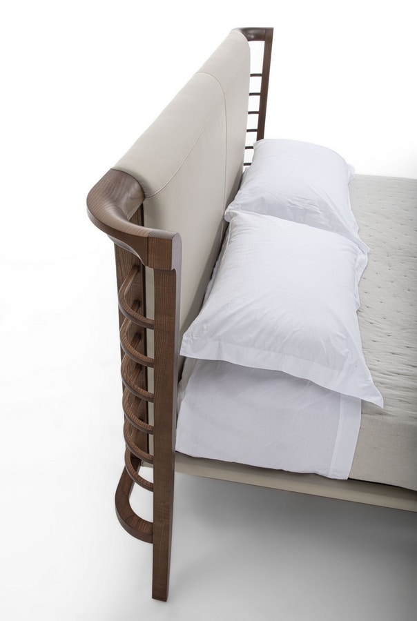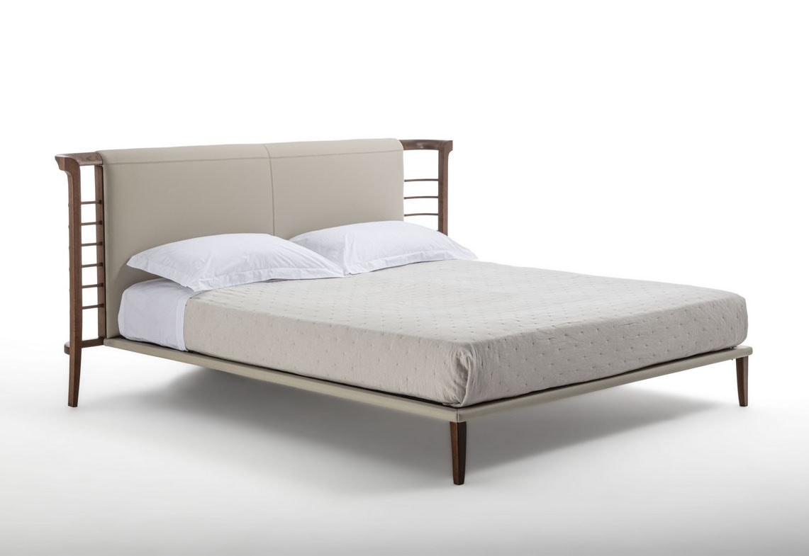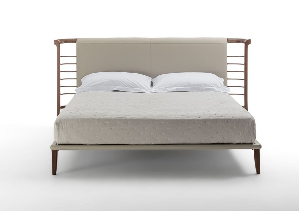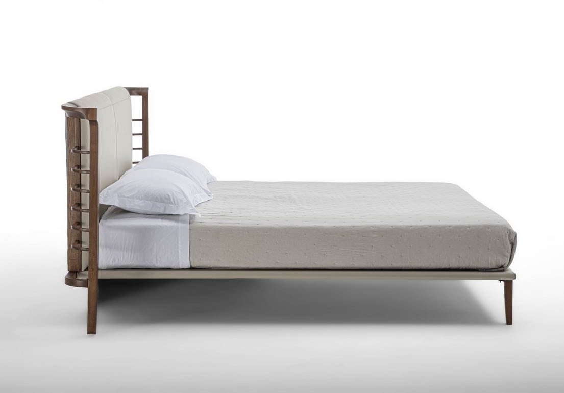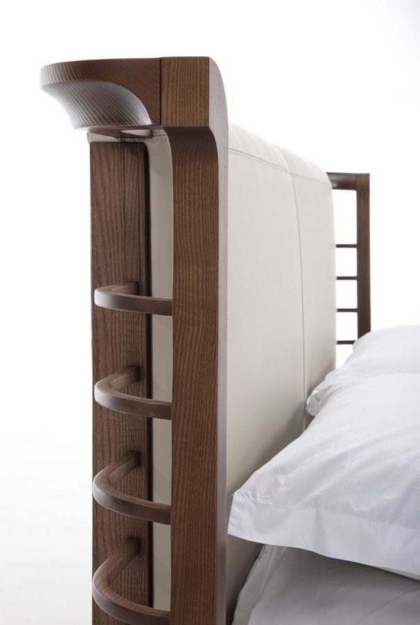Von der Dolfin-Linie inspiriertes Bett. Die Struktur besteht aus massivem Eschenholz und zeichnet sich durch dünne, geschwungene Profile aus, die das Design auflockern, was wiederum durch das Leder, das das Kopfteil und die Führungen umhüllt, verschönert wird.
