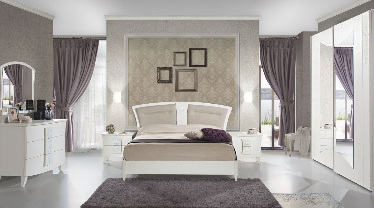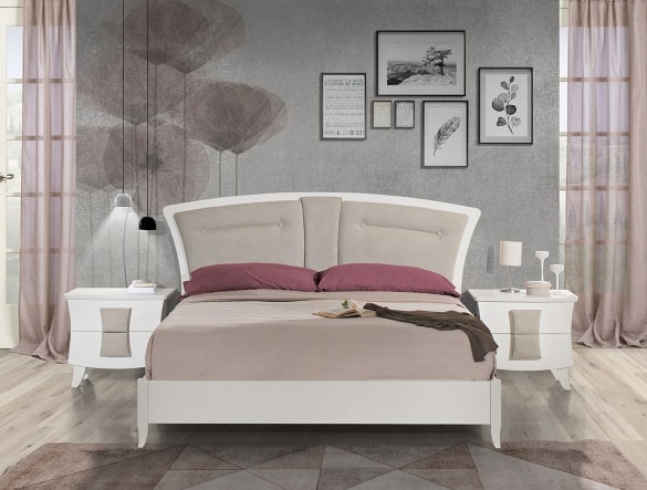 Bett Mary, Struktur aus weißer Esche. Gepolstertes Kopfteil aus Nabucco-Stoff mit handgefertigter Dekoration in der Mitte und Schwarosky-Einsatz. Bettrahmen in Esche weiß, ohne Behälter und ohne Netz.