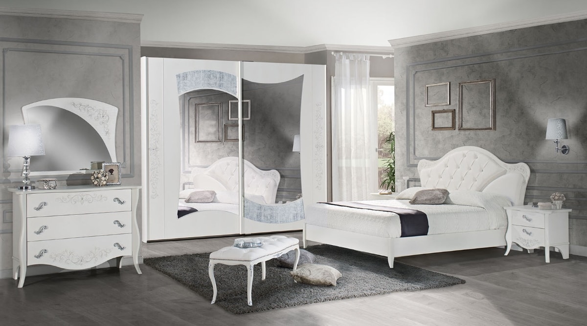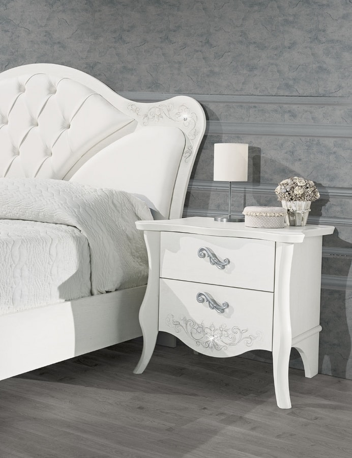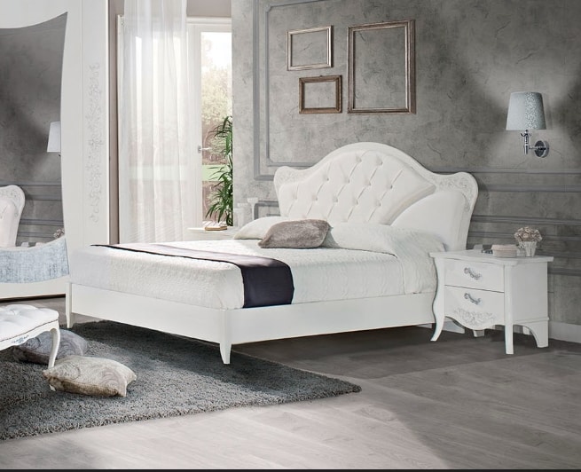 Tiffany-Bett. Kopfteil aus weißer Esche mit Capitonèe-Polsterung mit Swarosky-Einsätzen und glatter Polsterung. Handgefertigte Dekoration mit Swarovski-Einsatz auf dem Kopfteil. Bettrahmen aus weißer Esche, ohne Behälter und Netz nicht inbegriffen.