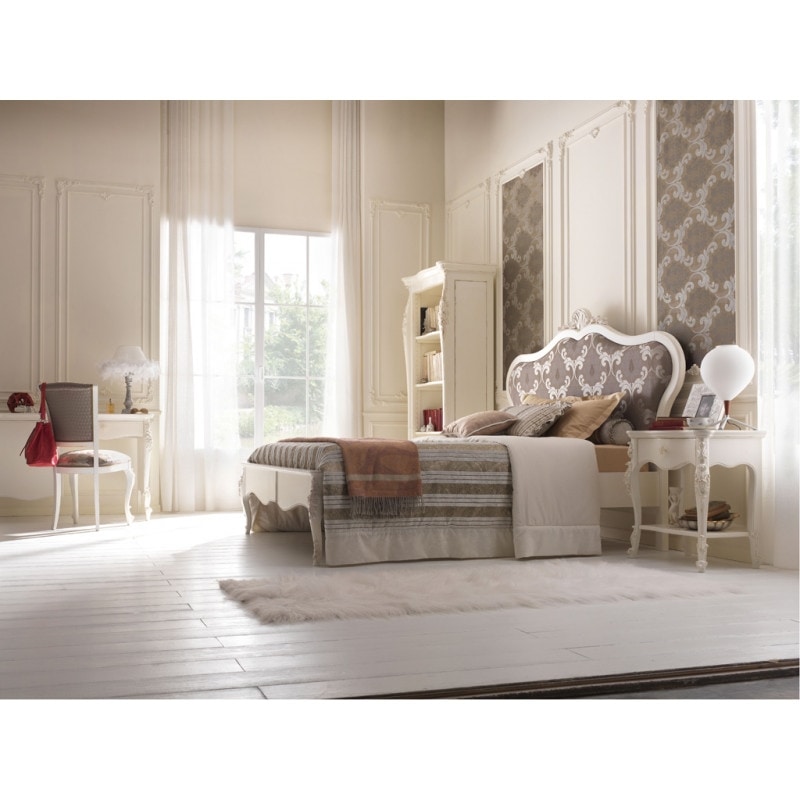 Preise anfordern Ähnliche ProdukteElegantes und raffiniertes Queensize-Bett mit gepolstertem Stoffkopfteil, gedacht für ein exklusives und stilvolles Zuhause. Geformtes Kopfteil mit Muschelschnitzerei im Mittelteil, niedriges Fußteil, das durch geformte und geschnitzte Beine vom Boden abgehoben wird. Die zarten, aber wichtigen Formen sind mit geschnitzten Details verziert. Diese Möbel sind einzigartige Werke, die mit alten Techniken hergestellt wurden und die Meisterschaft der Vergangenheit in die Gegenwart übertragen.