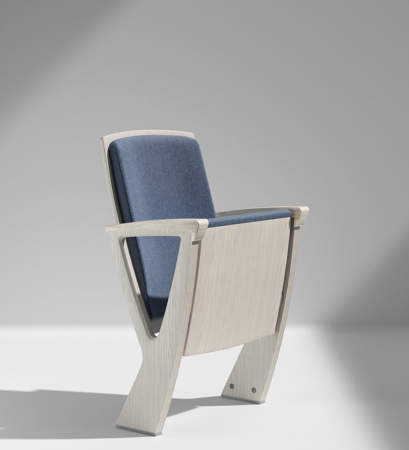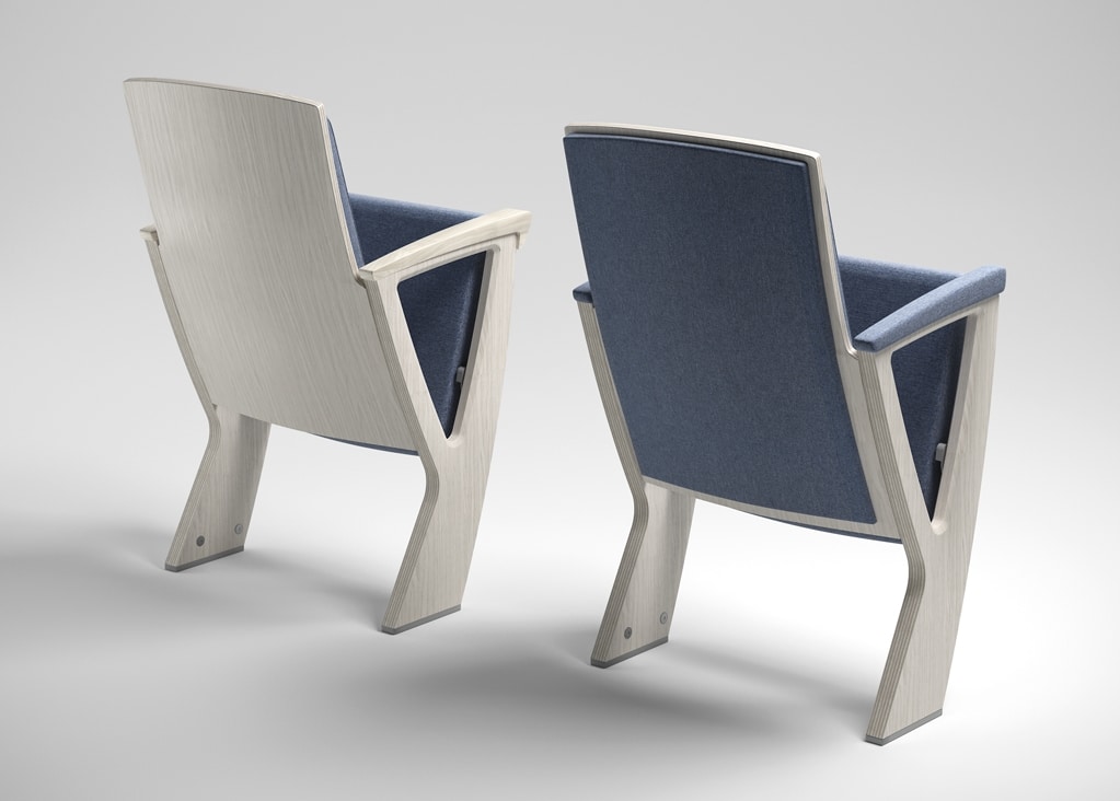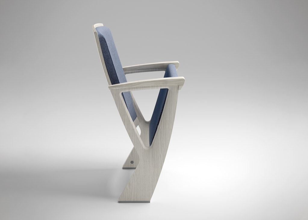 Ein Theaterstuhl mit essentiellen Linien und einer Seite, die an die Form einer Stimmgabel („Diapason“ in italienischer Sprache) oder eines „Y“ erinnert, hat die Besonderheit, dass er kompakt ist. Eleganz und Kompaktheit kommen noch mehr zur Geltung, wenn der Klappsitz vollständig geschlossen ist und sich perfekt an die Seite anpasst, ohne hervorzustehen, wobei seine elegante Form beibehalten wird. Es ist in Ausführungen erhältlich, die unendliche Kombinationen ermöglichen, mit feinen Holzoberflächen experimentieren und Polsterungen umfassen.