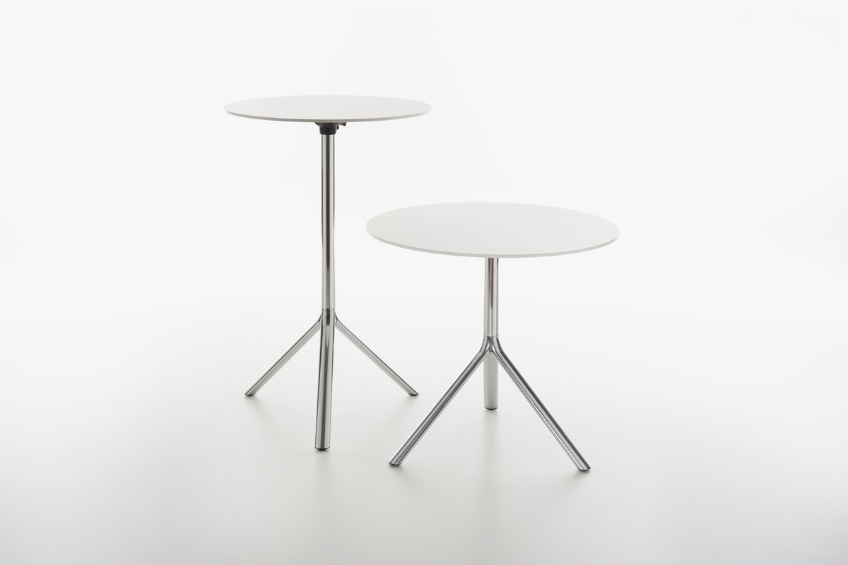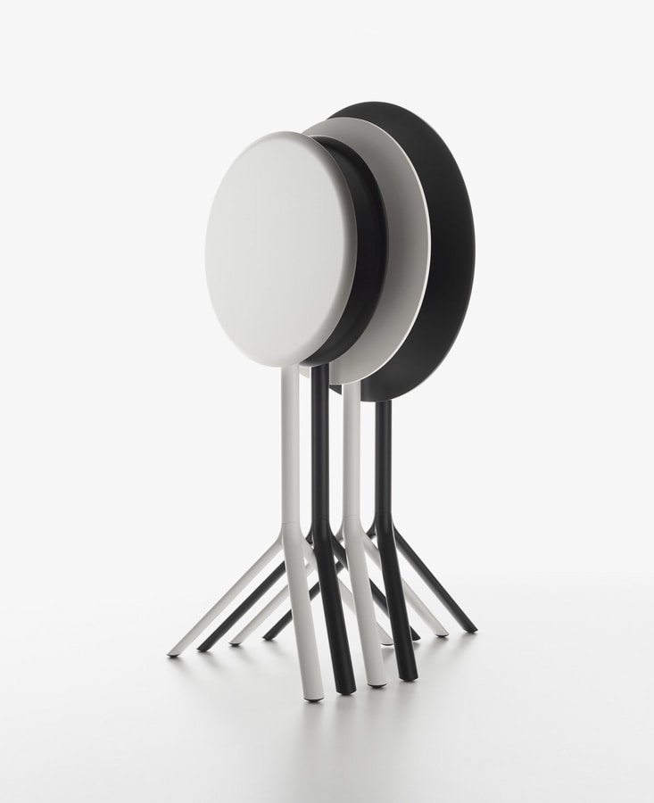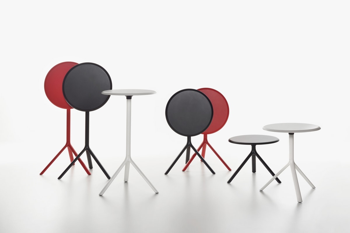 Tisch System, Gestell in pulverbeschichtetem Metall und Platte in Metall, MDF oder Vollaminat HPL in den Farben schwarz, weiß, verkehrsrot (nur Metall). Tischplatte klappbar.