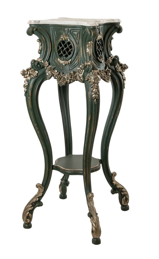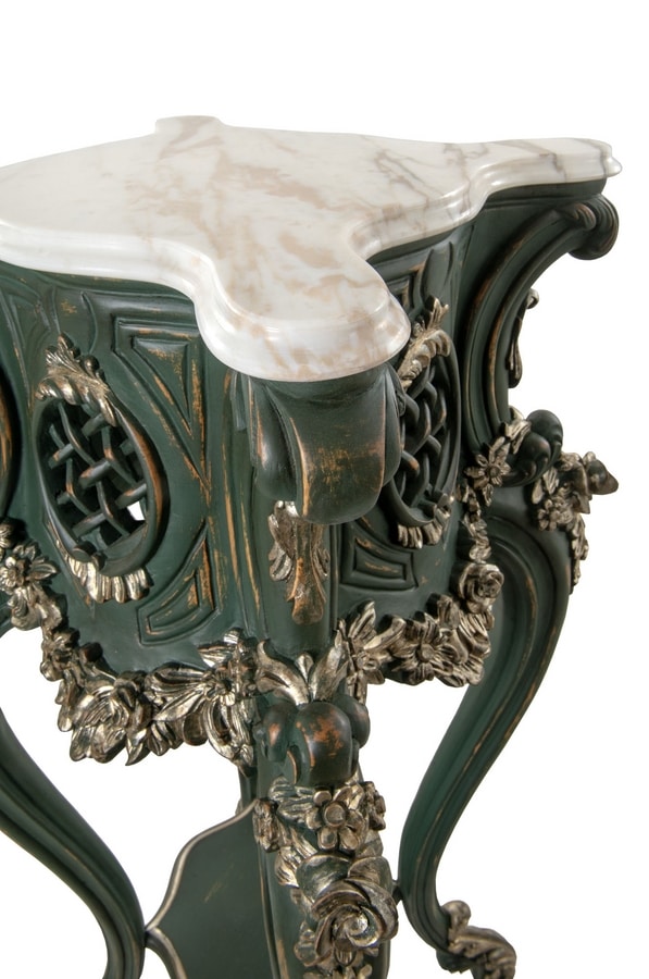 Blumenständer mit Marmorplatte Calacatta Gold, Finish LAFV lackiert, gebürstetes französisches Tempera-Grün, Lotus mit Details SG Silver Gold.