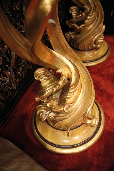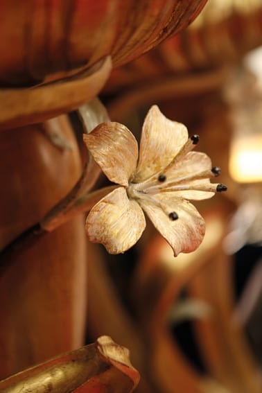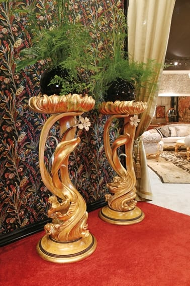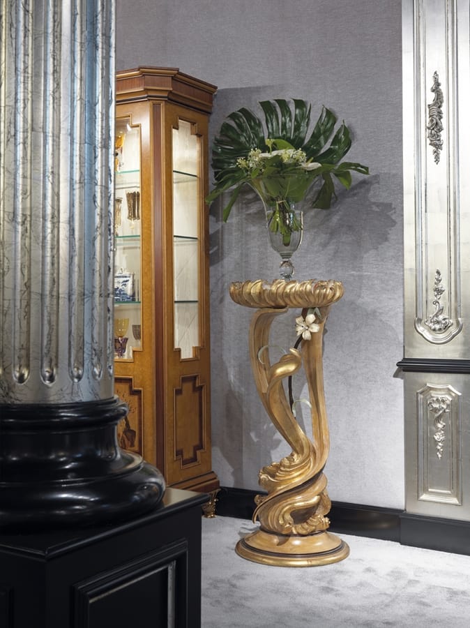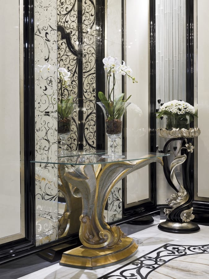 Handgeschnitzte Skulptur mit verziertem Schmiedeeisen-Einsatz mit antikem Gold und Farben. Das besondere Blumenmotiv eignet sich für luxuriöse Umgebungen, auch in einer zeitgenössischen Tonart in Silber und Schwarz. An die Konsole gekoppelt, deren Struktur das florale Element mit der Darstellung von Blättern enthält, die sich in freier Form entfalten, unterstützt eine zarte Glasplatte, die durch ihre Transparenz das künstlerische Erscheinungsbild dieses Stücks verstärkt.