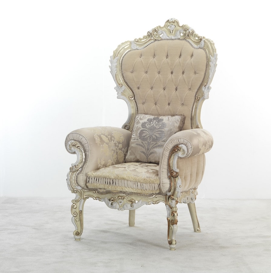 Sessel lackiert mit silberfarbenem Stoffbezug.