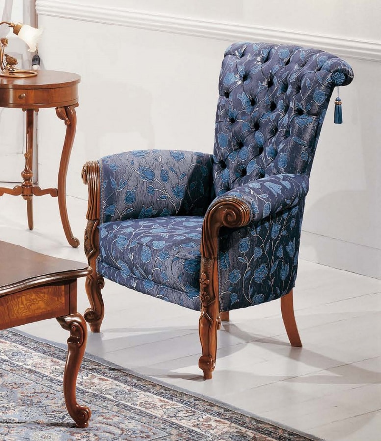 Luigi XV Sessel. Capitonné-Polsterung an der Rückenlehne. Holzbeine.