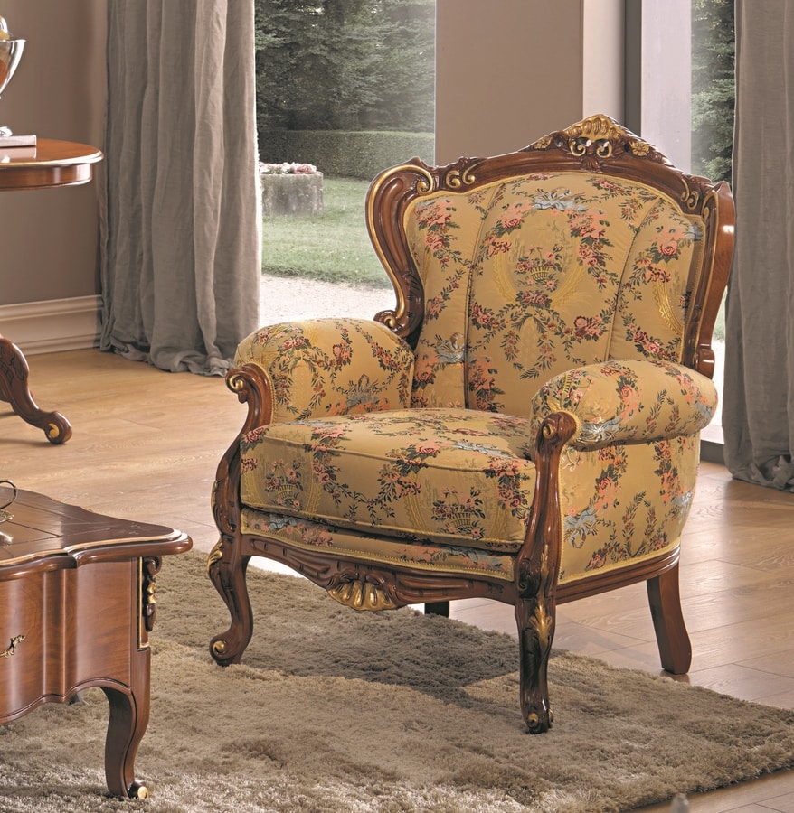 Sessel im klassischen Stil, Holzstruktur, handgefertigt geschnitzt. Stoffpolsterung.