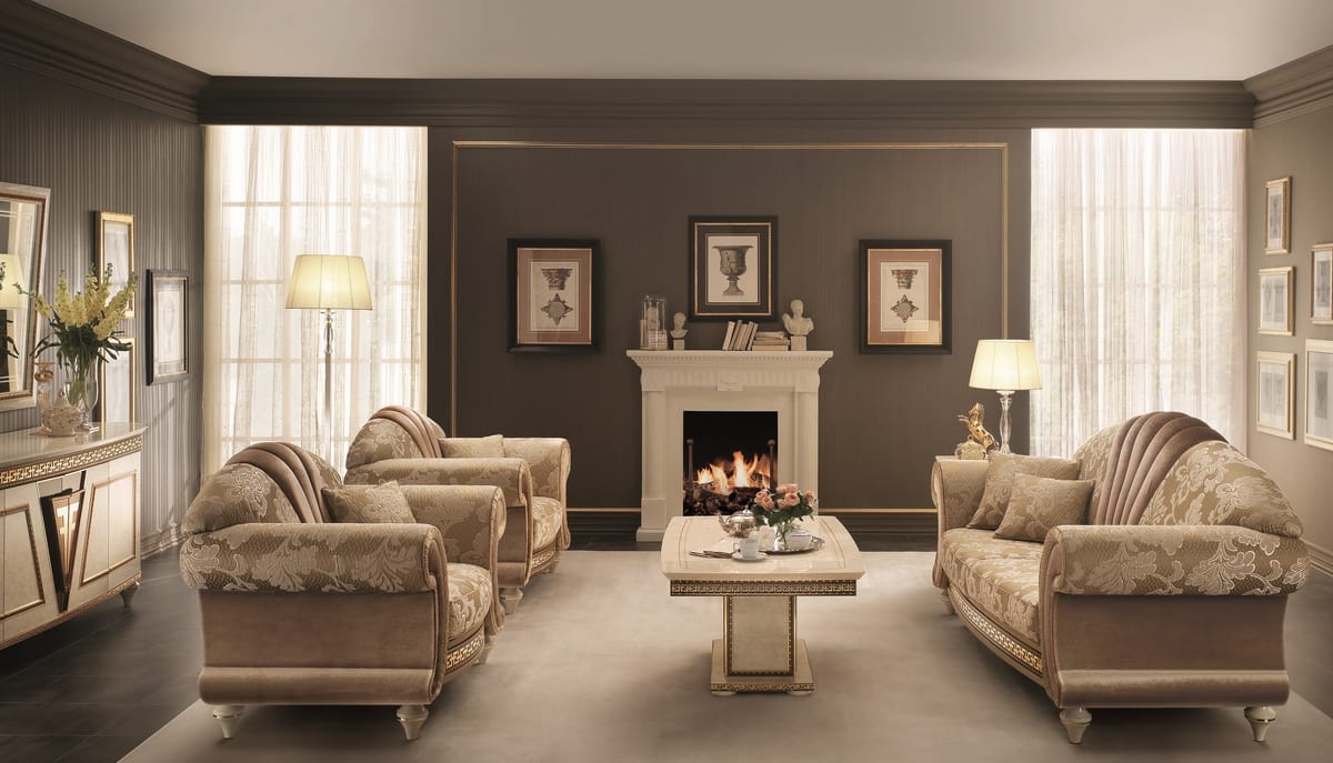 Die Wohnzimmermöbel verfügen über diese luxuriösen Sessel, die einen elegant geselligen Raum schaffen. Die weichen Linien und das zentrale fächerförmige Paneel geben diesem Sofa eine starke ästhetische Wirkung, die zeigt, dass es sich um ein Möbelstück von großem Wert handelt.