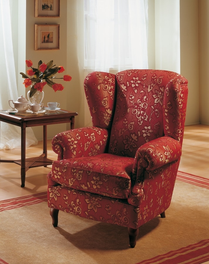 Klassischer gepolsterter Außensessel mit Massivholzstruktur.