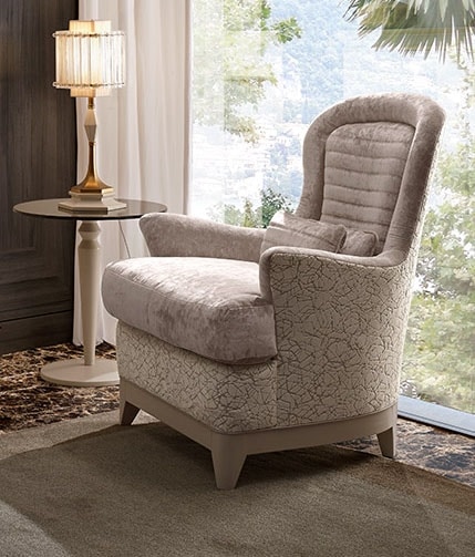 Sessel Bergere mit Holzgestell, Massivholzgestell, bequemer und umhüllender Polsterung aus Polyurethanschaum und Stoffbezug.