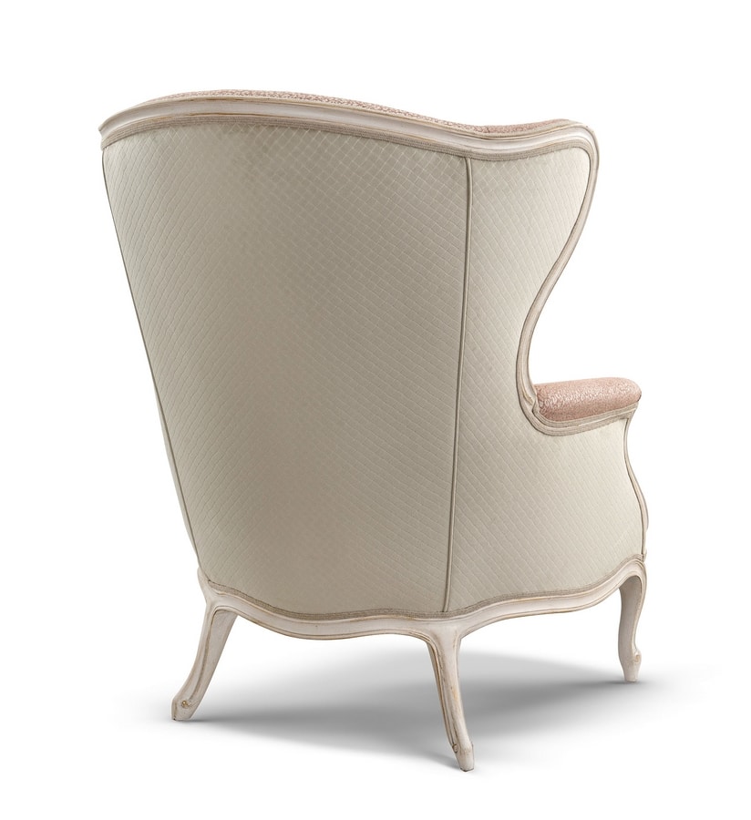 Sessel aus geschnitztem Holz, mit Stoff gepolstert, Ausführung LAFM, lackiert in gebürstetem, französischem Tempera-Weiß-Meringue mit Untergestell aus Blattgold. Nicht abnehmbarer Bezug.