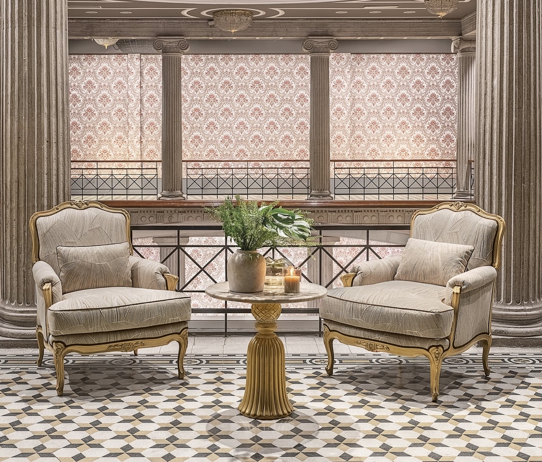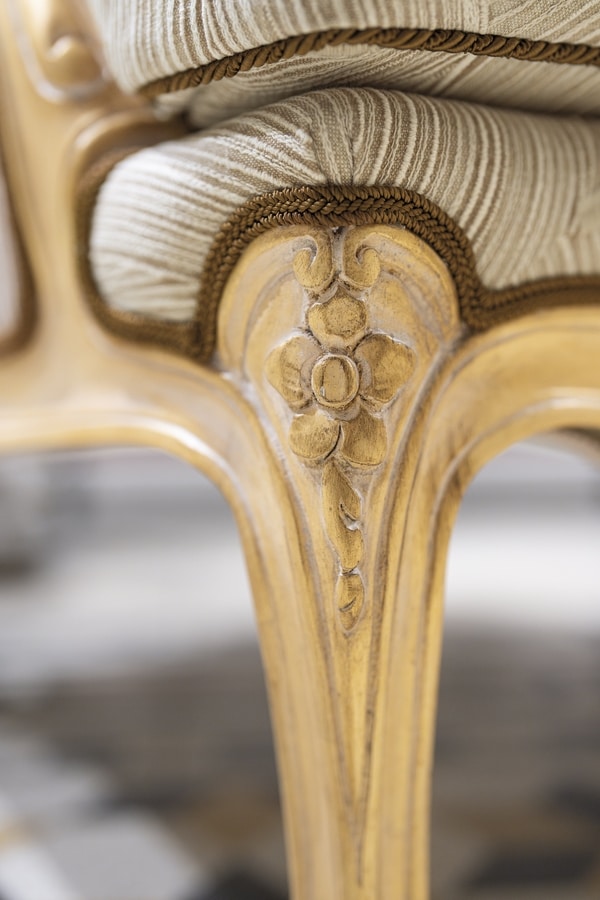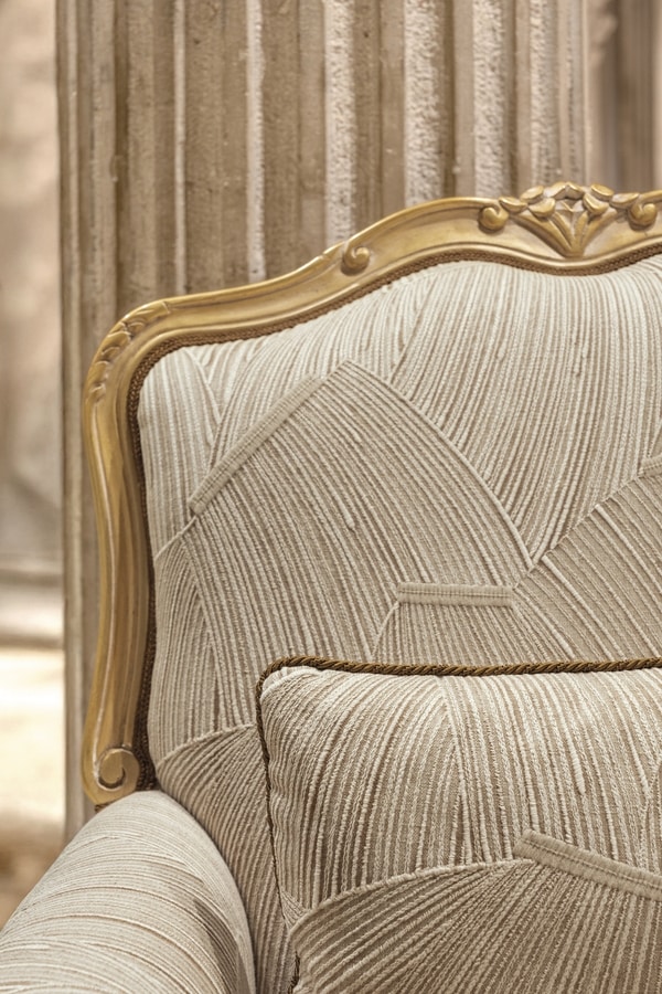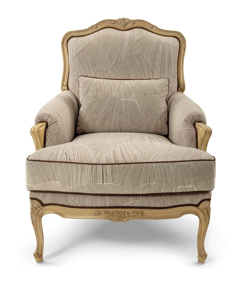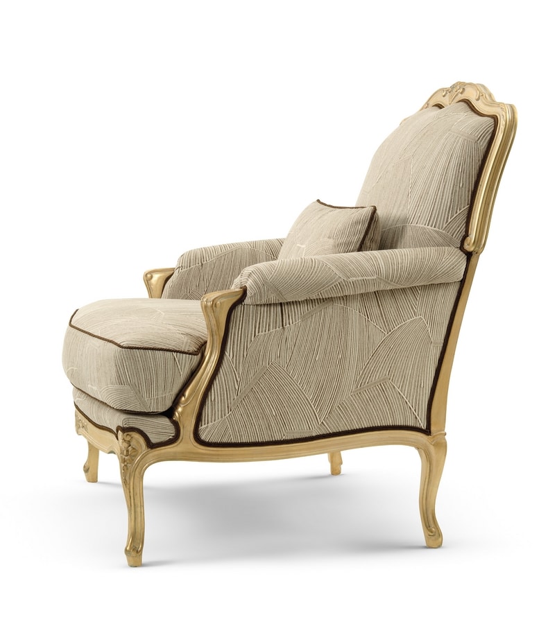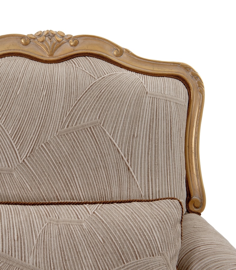 Anmutige Linien und geformte Details definieren diesen eleganten hölzernen Sessel, der durch ein Och -Finish in Blattgold mit baiser weißer Patina verbessert wird. Großzügige Polsterung und eine dekorative Stoffbedeckung mit kontrastierenden Rohrleitungen unterstreichen seinen klassischen und raffinierten Charakter.
