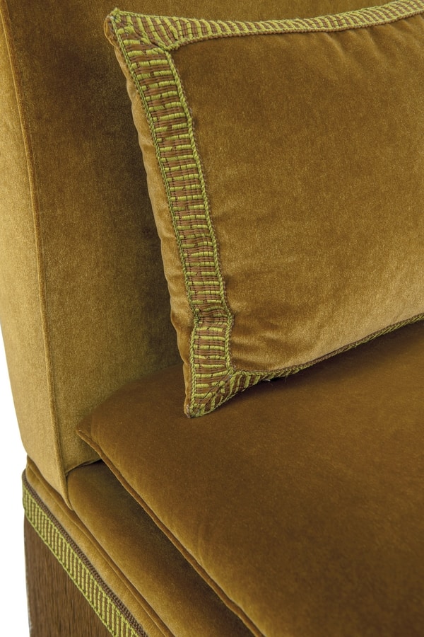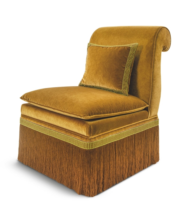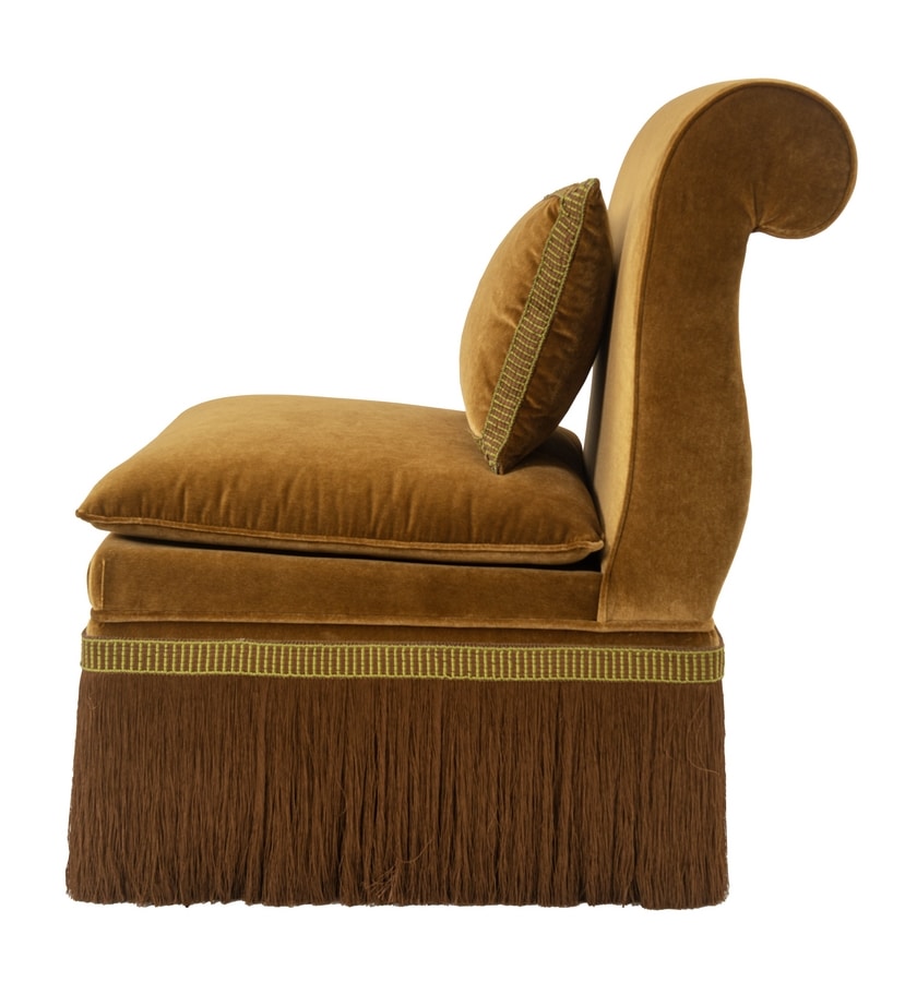 Polsterer Slipper -Sessel in weichem Samt mit einem passenden Kissen und einem eleganten dekorativen Rand an der Basis.
