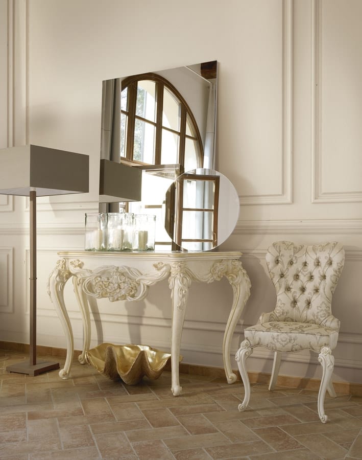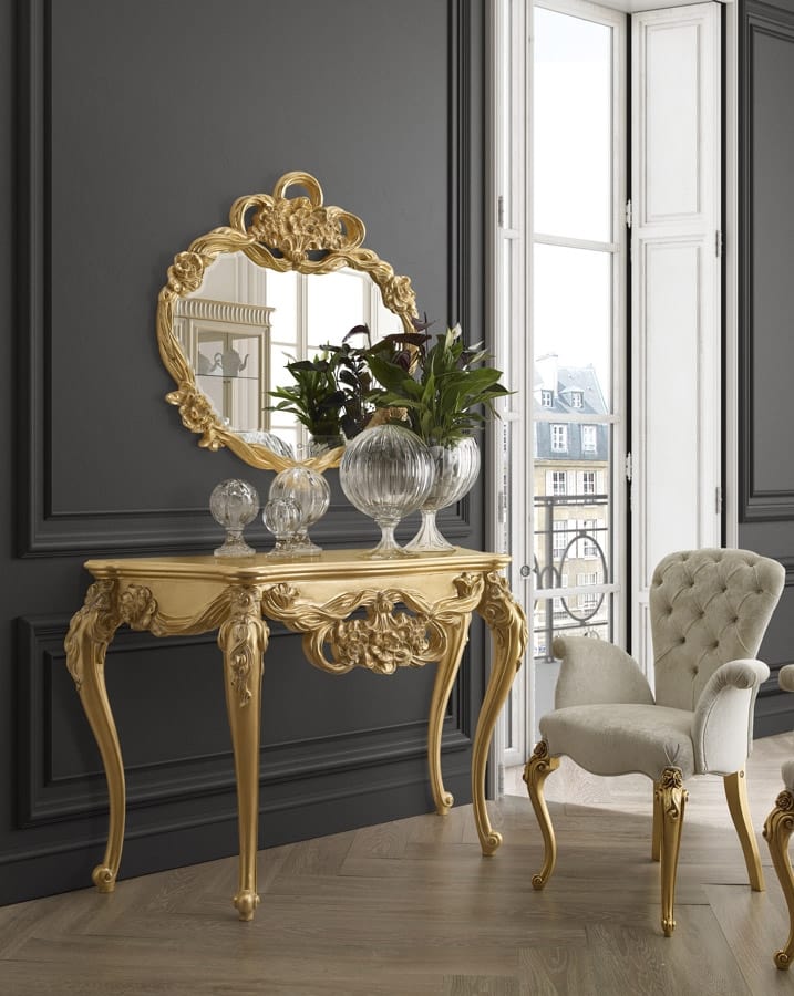 Konsole von Hand geschnitzt und in Blattgold oder weißem Finish erhältlich. Die perfekte Kombination in Kombination mit den Spiegeln Volpi.