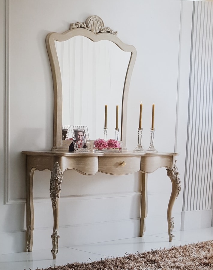 Konsole mit wellenförmiger Front, 1 Schublade, weiß gebeizt mit patinierten Schnitzereien.