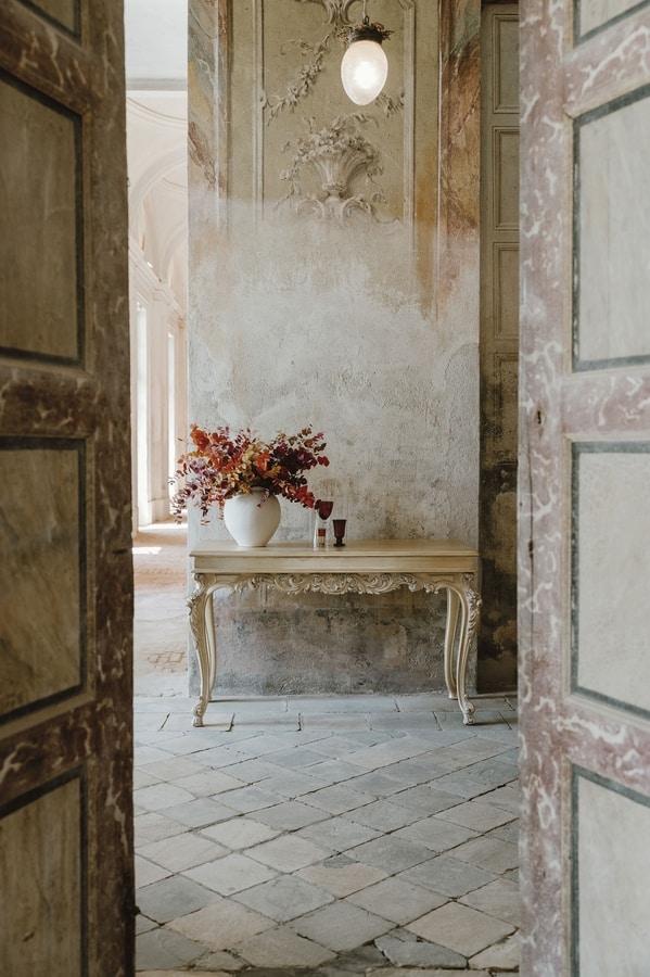 Konsole mit Platte und Sockel aus geschnitztem Holz, Finish OCH-Blattgold, patiniertes weißes Baiser (Oro Chic).