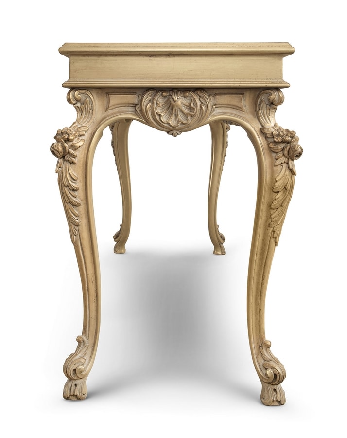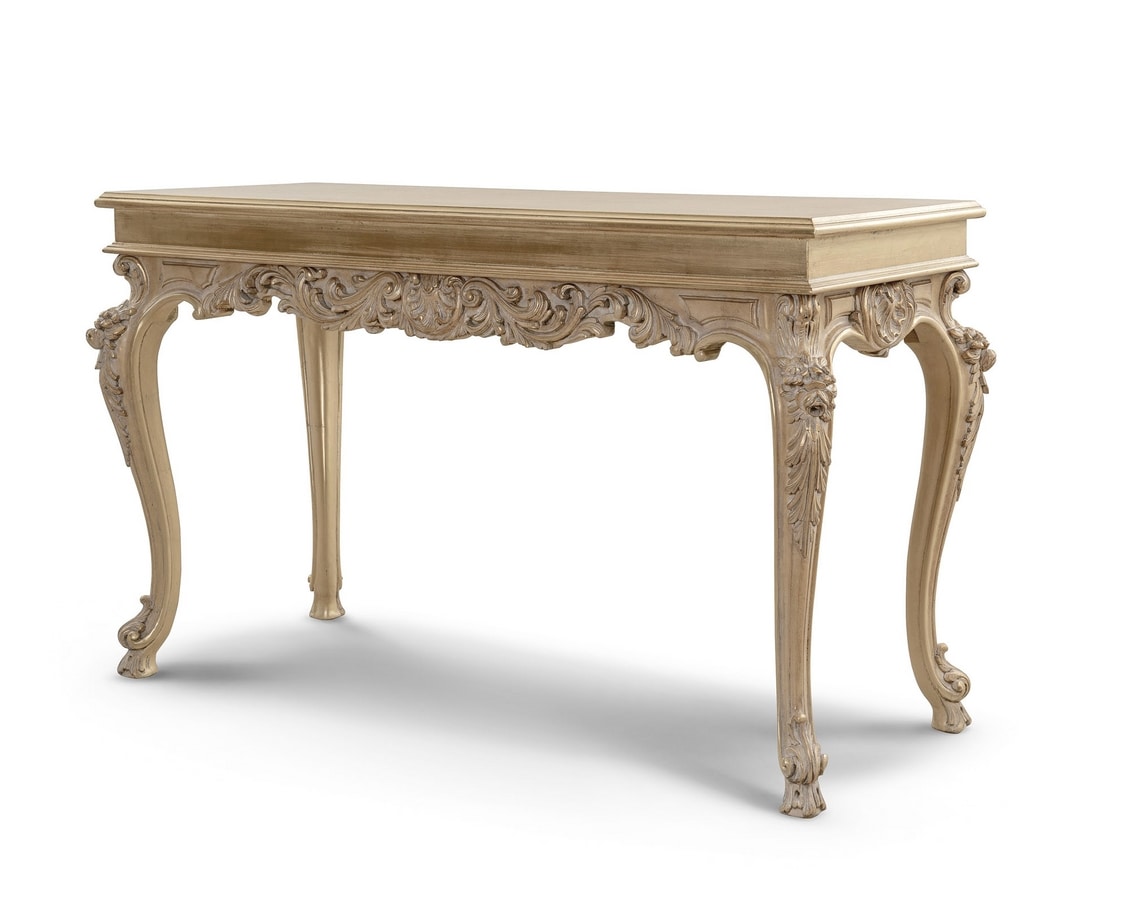 Klassische Konsole mit handgefertigten Schnitzereien und verziert mit OCH-Blattgold, patiniertem Baiserweiß.