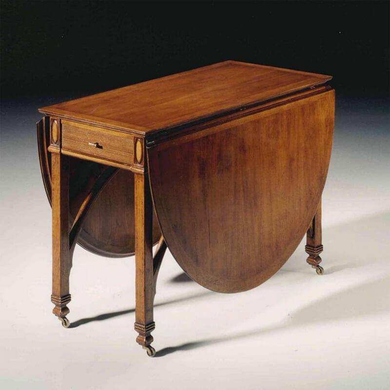 Uluru ist ein ovaler Tisch, der zu einer Konsole zusammengeklappt werden kann. Es hat zwei Schubladen und vier kleine Messingräder. Abmessungen entfaltet sind: 110 cm x 175 cm x 76 cm. Auf dem Foto gebeiztes Walnussholz mit Patina (Code: VR96) und normaler Belastung.