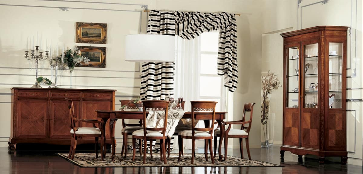 Die elegante Einfachheit des italienischen 18. Jahrhunderts, eignet sich perfekt für den heutigen Bedarf an praktischer Anwendbarkeit. Die Settecento Kollektion umfasst eine Vitrine mit abgeschrägten Gläsern und Innenbeleuchtung, quadratische oder ovale Tische in verschiedenen Größen, einige erweiterbar durch den Mittelwert der eingefügten Blätter und Stühle - mit und ohne Armlehnen - mit gepolsterten Sitzen in Stoff bezogen. Schubladenböden und Glas-Gehäuseboden sind auch in Stoff. Die Spitzen sind Modus aus Holz mit Intarsien Bespannung. Die Verfeinerung jedes Detail animiert Objekte mit wiederum Erinnerungen heraufbeschwören, Objekte, deren Form und Materialien erinnern an die Vergangenheit Trog die Augen der Gegenwart.