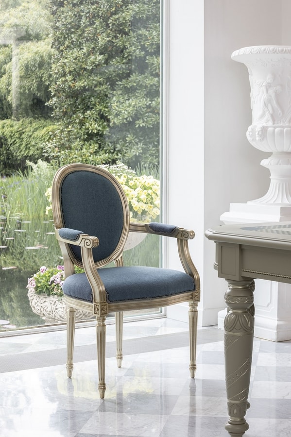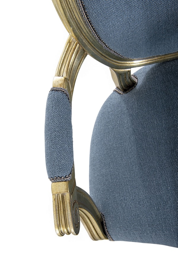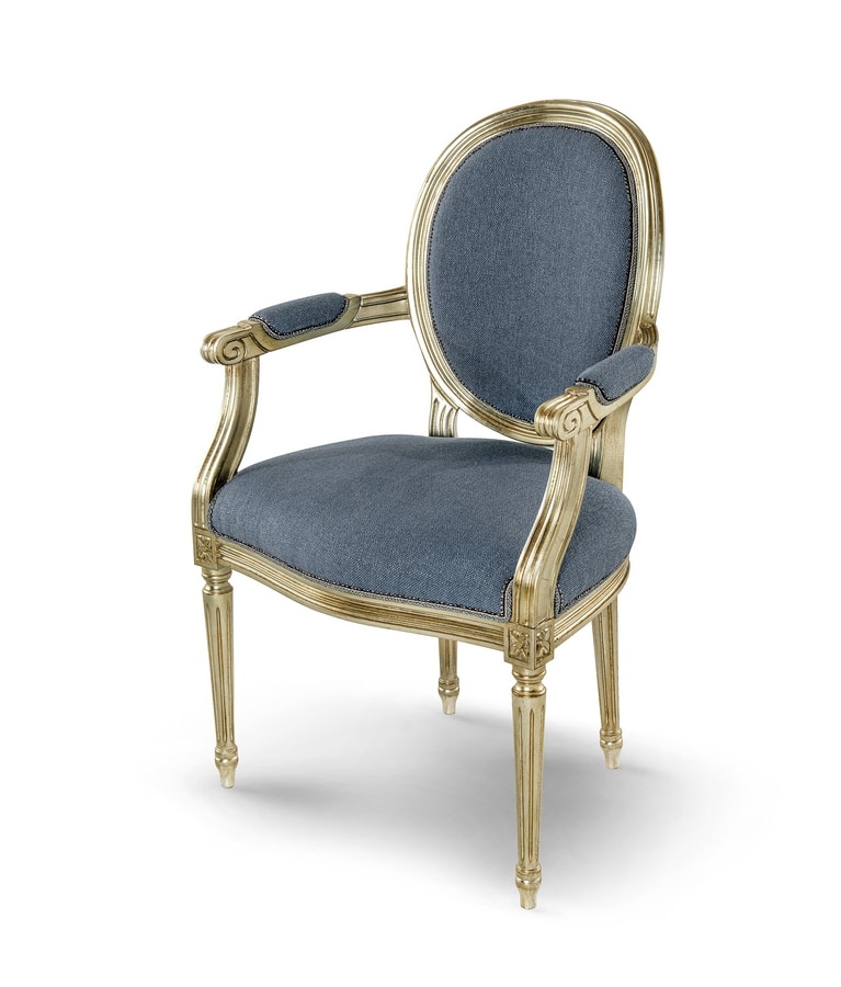 Stuhl mit Armlehnen aus geschnitztem Holz, gepolstert mit Stoff, Finish in Silber und Blattgold. Nicht abnehmbarer Bezug.