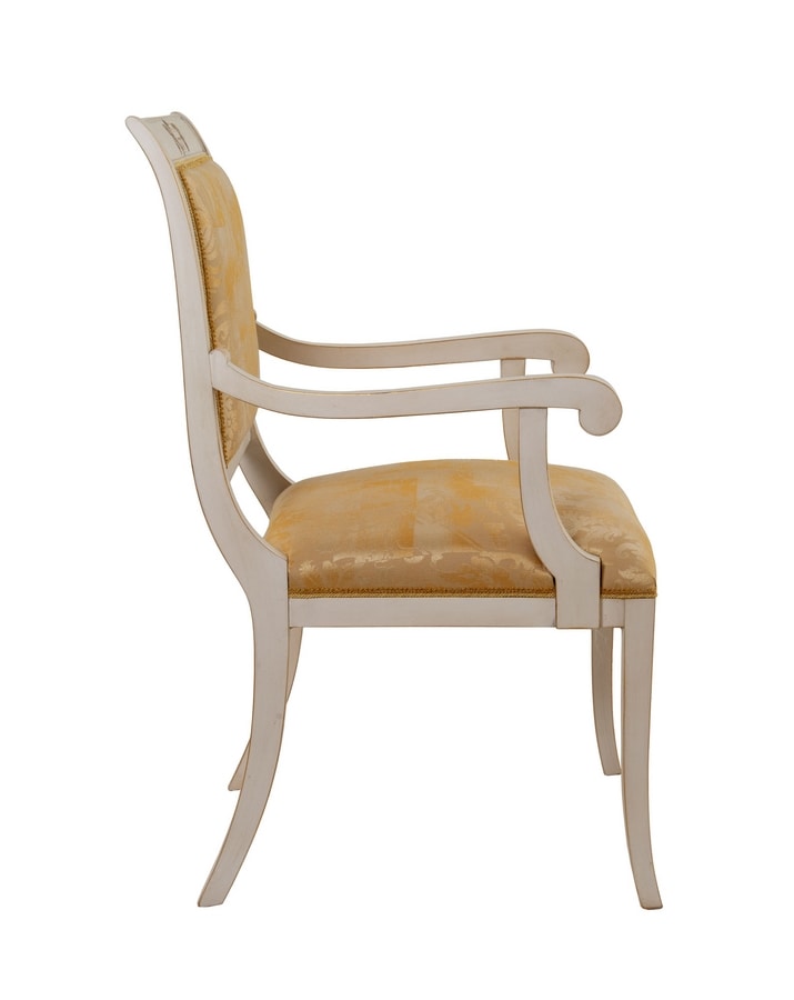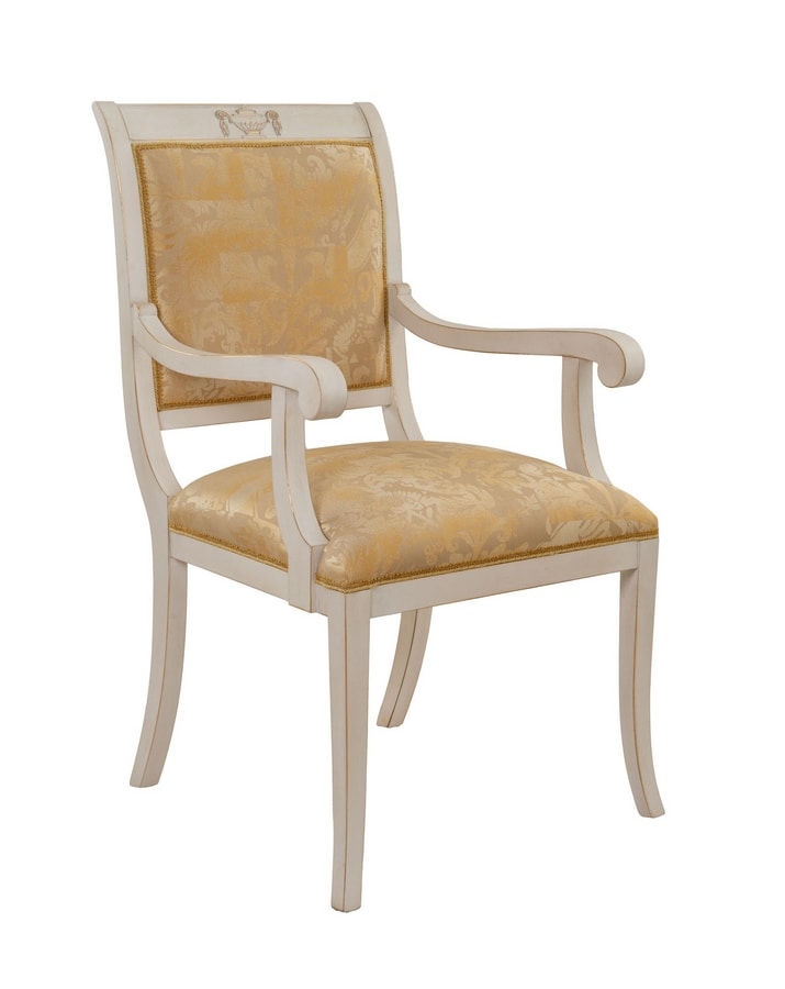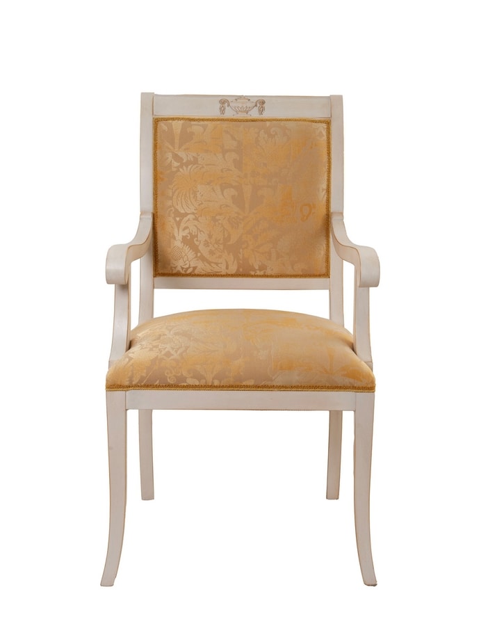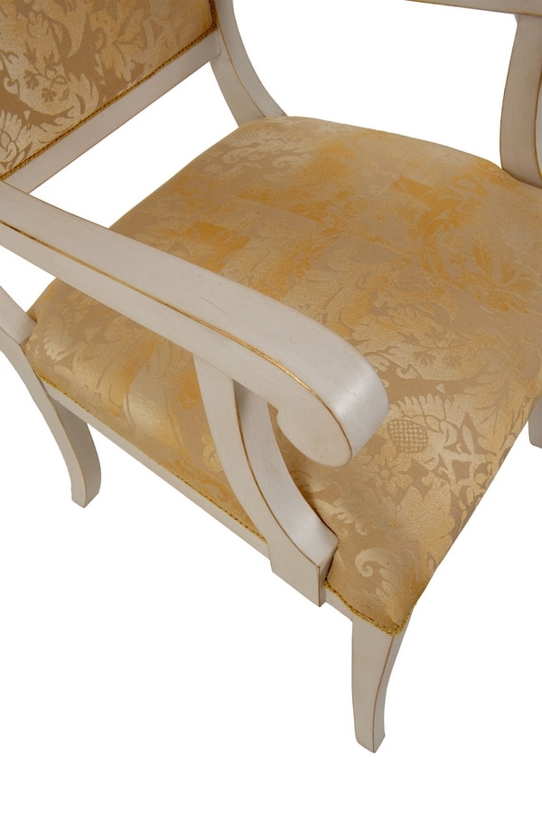Stuhl mit Armlehnen aus geschnitztem Holz, mit Stoff gepolstert, Finish LAFM lackiert, gebürstet, französisches Temperaweiß, Baiser mit Blattgoldbasis.