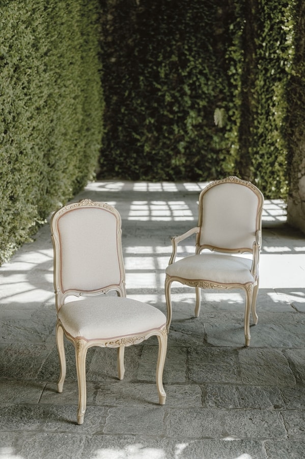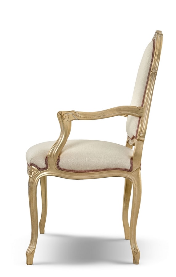 Stuhl mit Armlehnen aus geschnitztem Holz, gepolstert mit Stoff, Finish OCH-Blattgold patiniert weiß Baiser (Oro Chic). Nicht abnehmbarer Bezug.