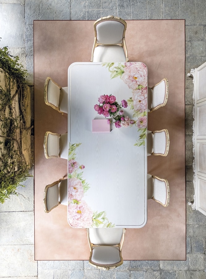 Auf den Louis-XV-Stühlen, die den Tisch begleiten, sind zarte Geflechte zu sehen, die mit und ohne Armlehnen präsentiert werden. Der Stoff erinnert an die Oberfläche der Oro Chic-Struktur.