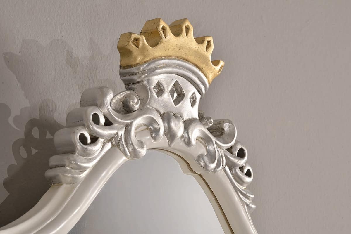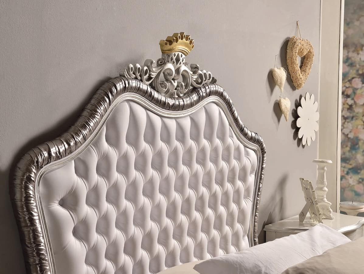 Einzelbett mit Bettrahmen, weiß lackiert, mit Details in silbernem Blatt.