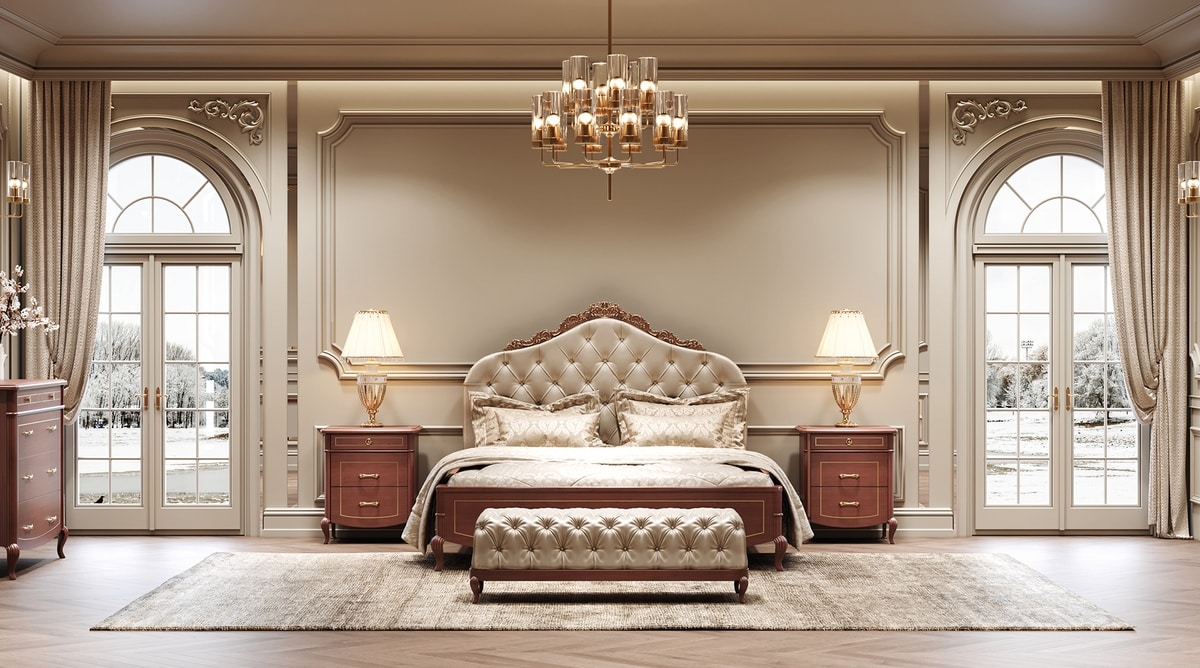 Das Gefühl von Luxus, das Bellini Royal ausstrahlt, ist ein visuelles und haptisches Erlebnis von überwältigendem Vergnügen: Ein Schlafzimmer von großer Exklusivität und Vornehmheit. Reich an kreativen Details, geprägt von aufwendiger Schnitzerei und sorgfältig ausgewählten Materialien. Mit goldenen oder silbernen Details, handgefertigten Ausführungen aus Bruyèreholz oder weiß lackiert.