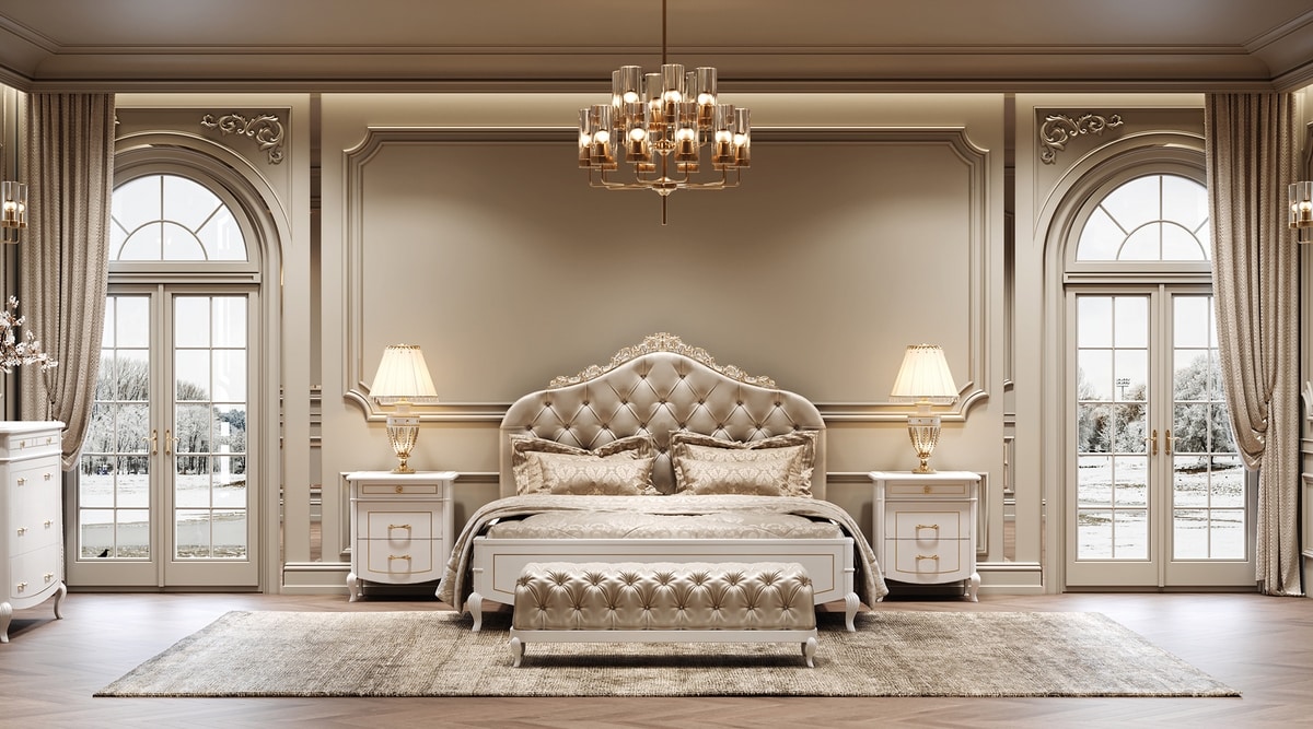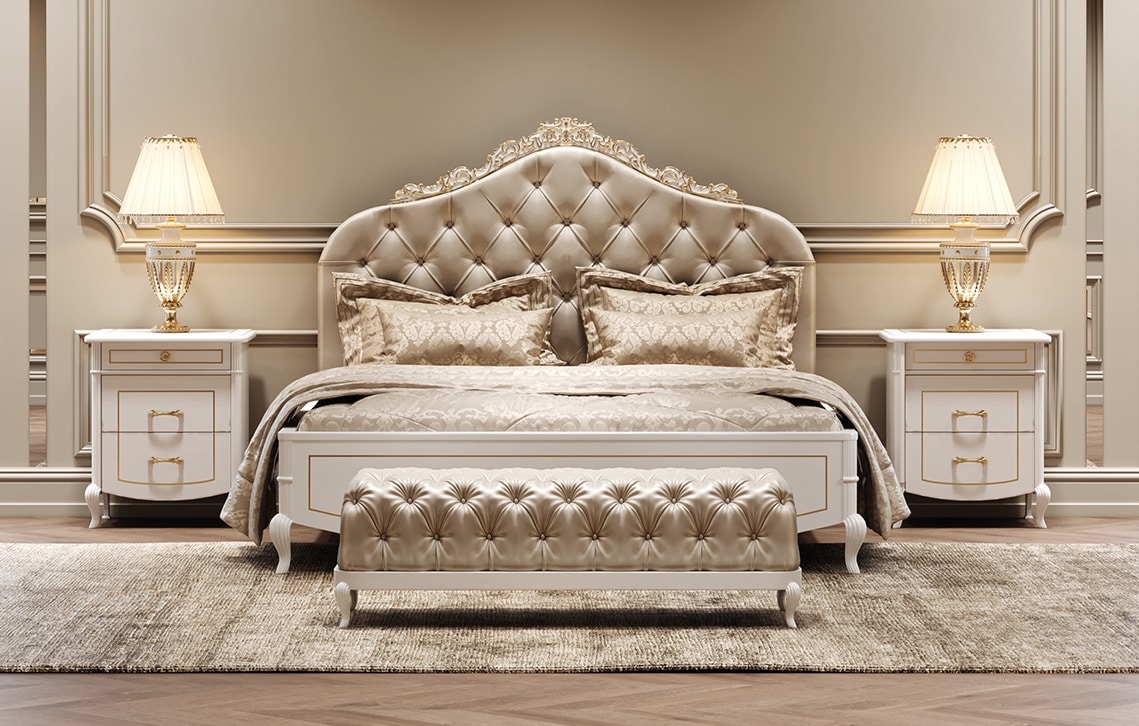 Das Gefühl von Luxus, das Bellini Royal ausstrahlt, ist ein visuelles und haptisches Erlebnis von überwältigendem Vergnügen: Ein Schlafzimmer von großer Exklusivität und Vornehmheit. Reich an kreativen Details, geprägt von aufwendiger Schnitzerei und sorgfältig ausgewählten Materialien. Mit goldenen oder silbernen Details, handgefertigten Ausführungen aus Bruyèreholz oder weiß lackiert.