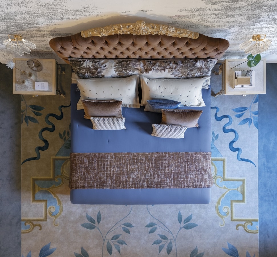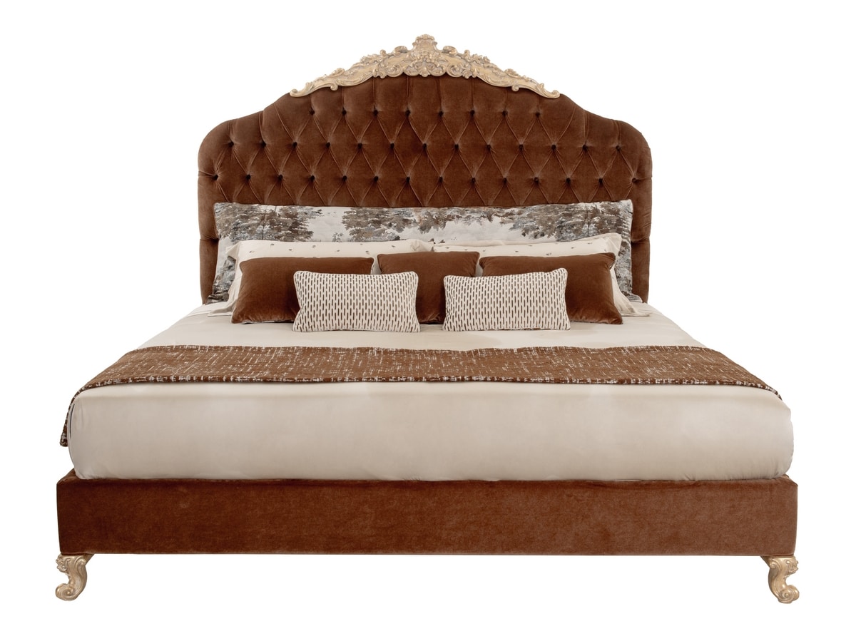 Ein Bett mit einer umarmenden Silhouette, gekrönt von einem majestätischen handgeschnitzten Wappen und fein geformten Füßen, die in Och -Blattgold in Baiser weiß packt wurden. Das hohe Kopfteil, das im klassischen Capitonné-Stil gepolstert und handgepackt ist, entspricht dem stoffbedeckten Bettrahmen und schafft eine harmonische Komposition, die Komfort mit der künstlichen Raffinesse verbindet.