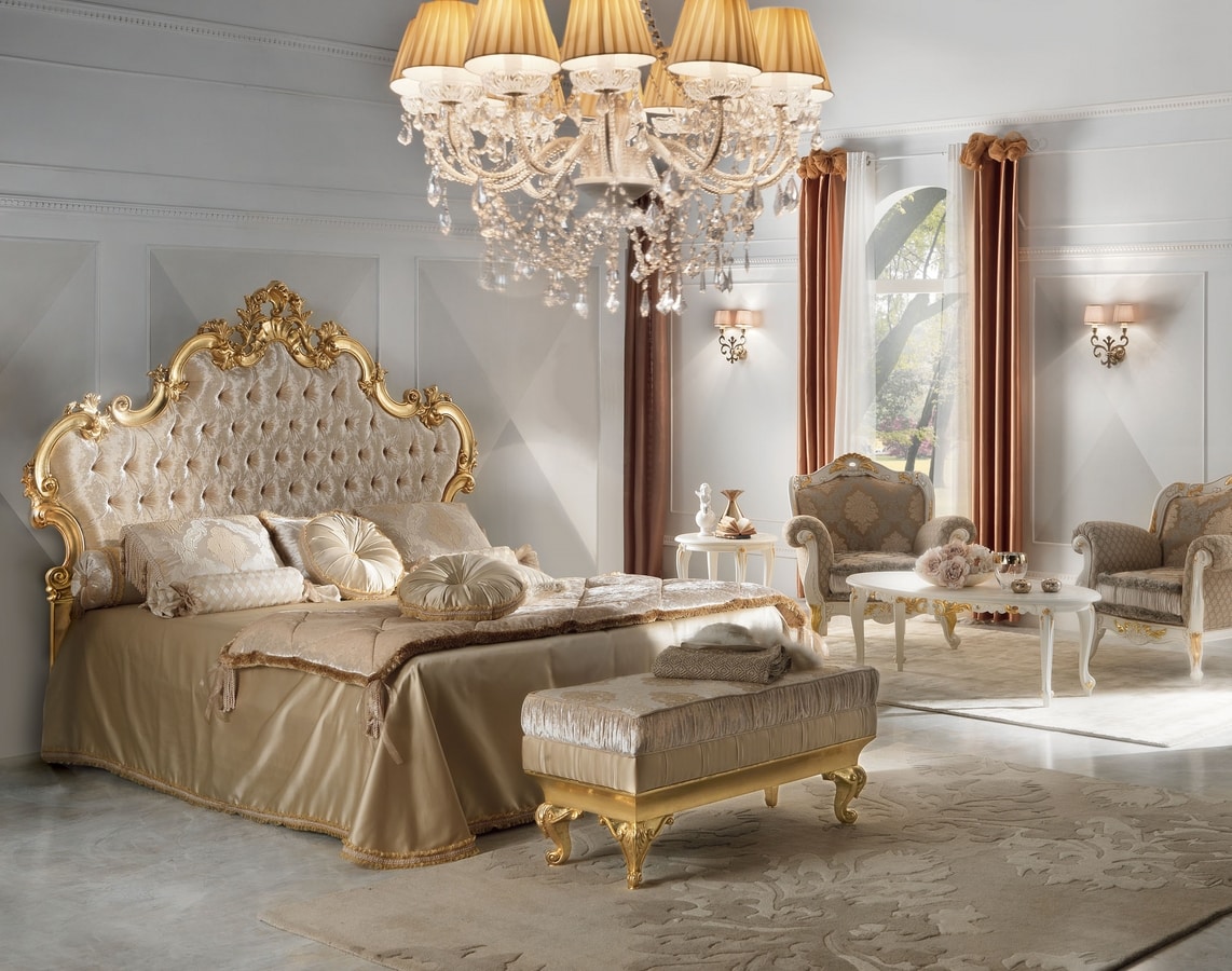 Diamantbett 180x200 aus geschnitztem Holz, komplett aus Blattgold, Kopfteil aus gestepptem Samt.