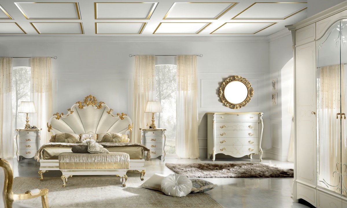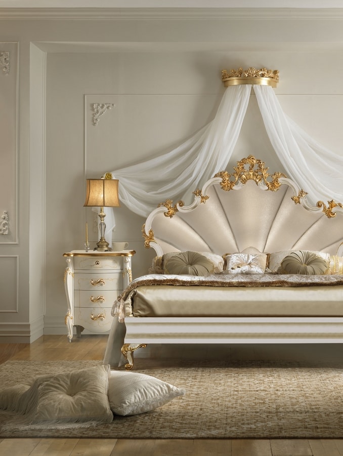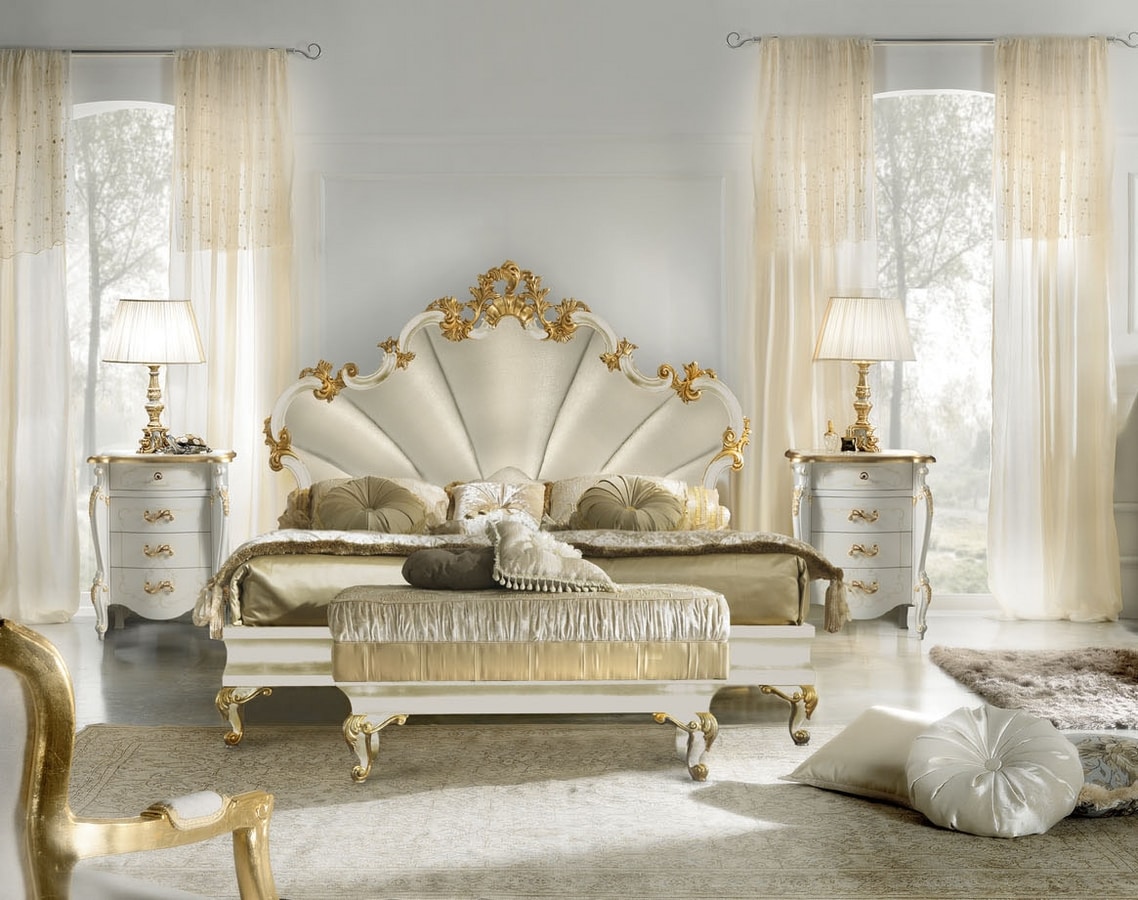 Geschnitztes Holzbett Diamante180x200, patiniert mit Blattgolddetails, Kopfteil aus gestrahltem Samt.