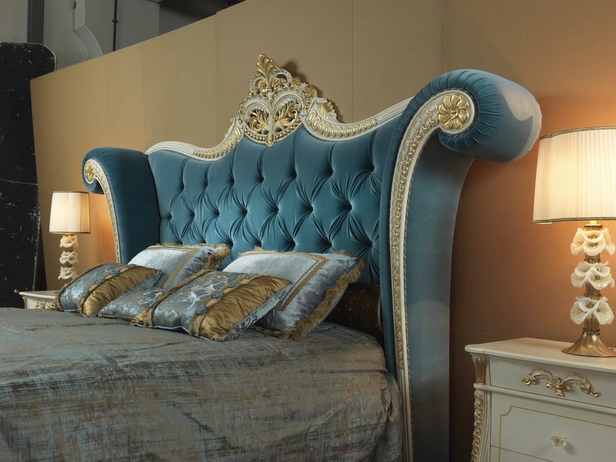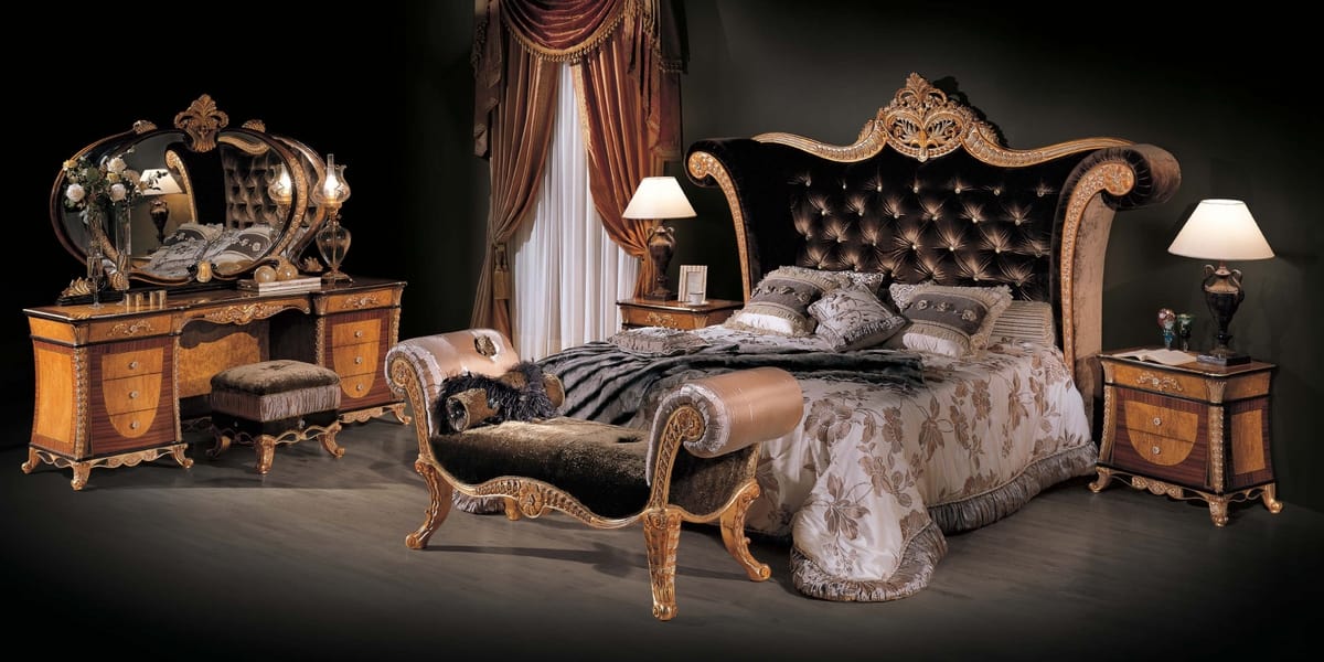Preise anfordern Ähnliche ProdukteKlassisches geschnitztes Bett. Das geschnitzte Kopfteil ist in edlem Samt mit Capitonné-Arbeiten und Svarovsky-Knöpfen gepolstert. Das Bettset und die dazu passenden Dekokissen werden aus hochwertigen Stoffen hergestellt, die von den renommiertesten italienischen Webereien ausgewählt und hergestellt werden. Für Möbel verwenden wir verschiedene Essenzen kombiniert mit Schnitzereien, die von erfahrenen Händen von erfahrenen Handwerkern hergestellt werden. Unsere klassischen Betten können mit speziellen Größen entsprechend den Bedürfnissen unserer Kunden hergestellt werden. Für große Räume werden die Möbel nicht nur mit der klassischen Kommode und Nachttischen vervollständigt, sondern mit einer Kommode mit Spiegeln und einer Bank angereichert. Möglichkeit anderer Lackierungen und Beschichtungen.